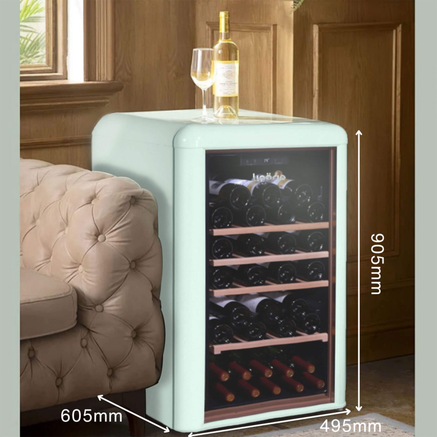 Cette cave de service LJCV52GREEN design vintage avec une finition lisse et brillante et des détails de garniture argentés qui ajoutent une touche d'élégance pour s'adapter à n'importe quel design ou concept de cuisine. Idéale dans un bureau, séjour, sous escalier, cuisine, chambre. Solide charnière installée d'origine à droite (porte non réversible). L'air brassé permet de réduire les écarts naturels de température entre le haut et le bas de la cave (mono température). Le réglage électronique permet de choisir la température au degré près entre 5°C et 20°C