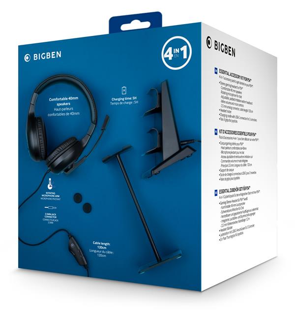 - Pack d'accessoires 4-en-1 pour bien débuter sur votre PS4(TM) ! - Casque gaming stéréo pour PS4(TM) - Haut-parleurs confortables de 40mm - Microphone pivotant pour le chat - Arceau ajustable et rembourré en imitation cuir - Commandes volume et mute intégrées - Prise Jack 3.5 mm, longueur du câble : 120 cm - Support de casque - Socle de charge à connecteurs micro-USB pour 2 manettes - Paire de grips pour joystick.