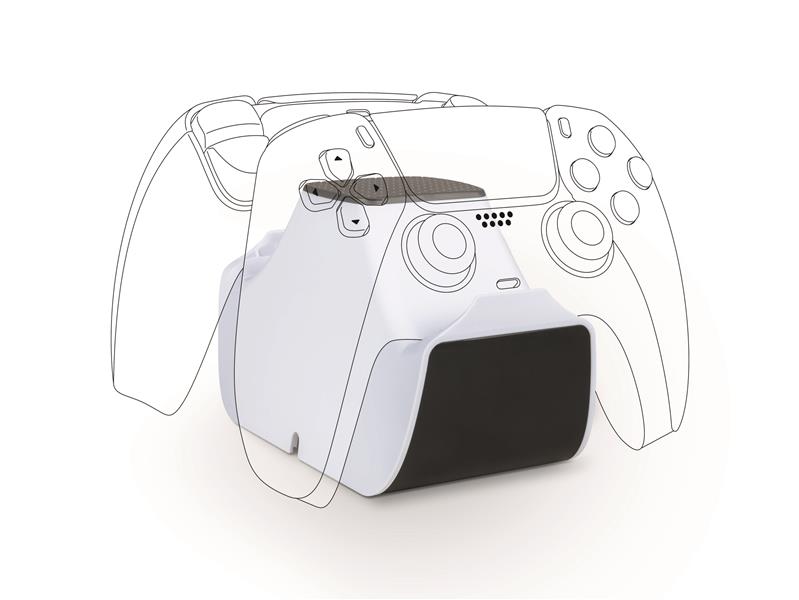 SOCLE DE CHARGE POUR MANETTES OFFICIELLES PS5 DUALSENSE Rangez et chargez vos manettes PS5 grâce à ce support assorti au design de la console : - Rechargez 2 manettes Dualsense simultanément - Socle de charge à connecteurs métalliques : pas de branchement nécessaire - Charge rapide (3H) - Câble d'alimentation secteur.