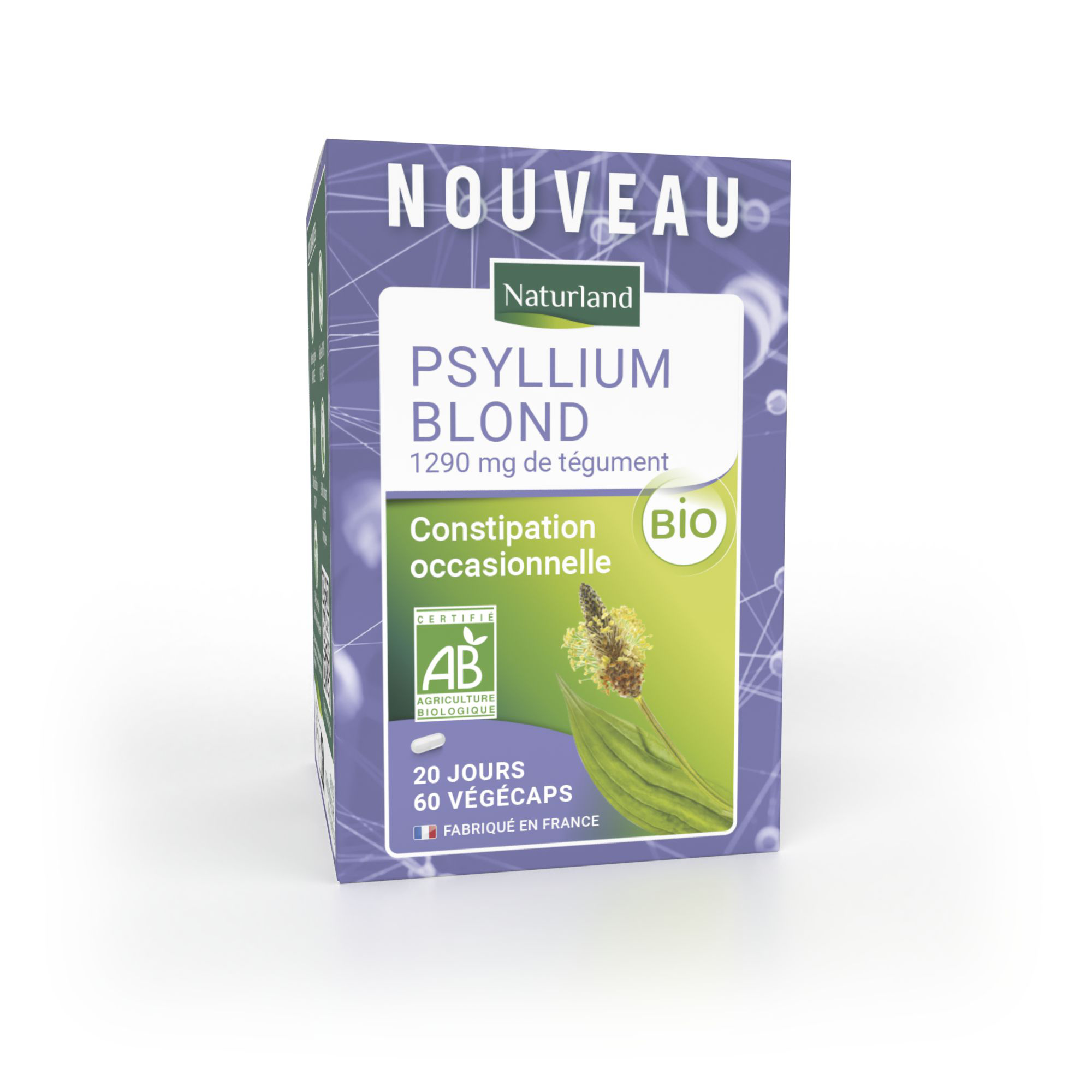 COMPLÉMENT ALIMENTAIRE. VÉGÉCAPS PSYLLIUM BLOND BIO CONTRIBUE AU RAMOLLISSEMENT DES SELLES ET À MAINTENIR UNE BONNE SANTÉ INTESTINALE. Naturland Psyllium Blond Bio 60 Végécaps est un complément alimentaire à base de psyllium blond qui contribue au ramollissement des selles et à maintenir une bonne santé intestinale en cas de constipation occasionnelle. Sans colorant ni additif chimique. Vegan. Certifié Agriculture Biologique. Fabriqué en France.