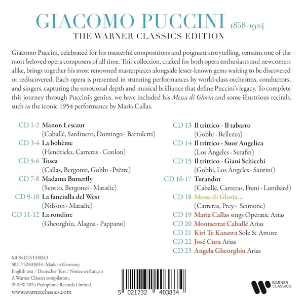 Giacomo Puccini (1858-1924), célèbre pour ses compositions magistrales et ses récits poignants, reste l'un des compositeurs d'opéra les plus appréciés de tous les temps. Ce coffret qui célèbre le centenaire de sa disparition, conçue pour les amateurs d'opéra comme pour les néophytes, rassemble ses chefs-d'oeuvre les plus renommés et des joyaux moins connus qui ne demandent qu'à être découverts ou redécouverts. Chaque opéra est présenté dans des interprétations époustouflantes par des orchestres, des chefs d'orchestre et des chanteurs de classe mondiale, capturant la profondeur émotionnelle et l'éclat musical qui définissent l'héritage de Puccini. Pour compléter ce voyage à travers le génie de Puccini, nous avons inclus sa Messa di Gloria et quelques illustres récitals, comme les emblématiques de Maria Callas en 1954, Montserrat Caballé, Kiri Te Kanawa, Angela Gheorghiu ou encore José Cura.
