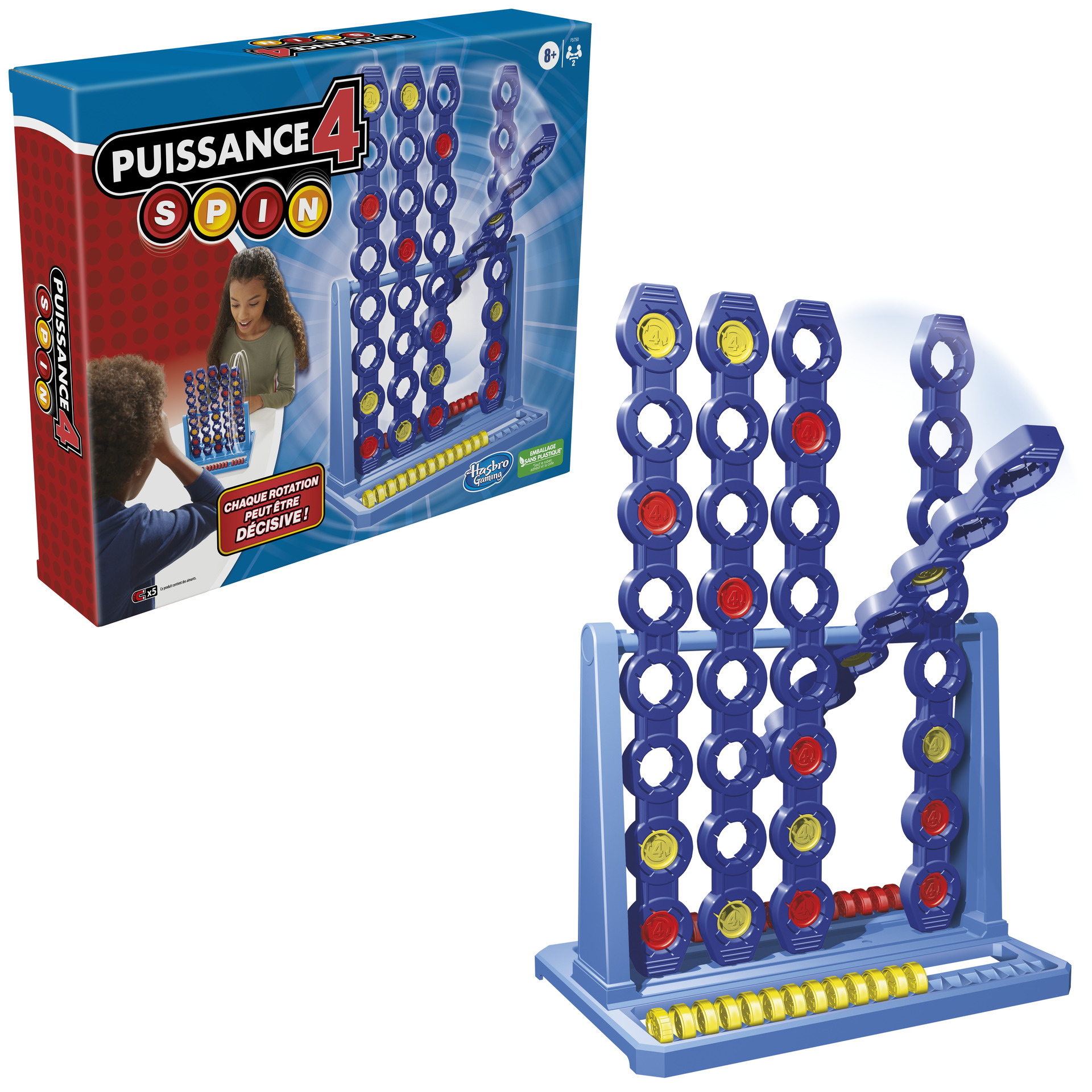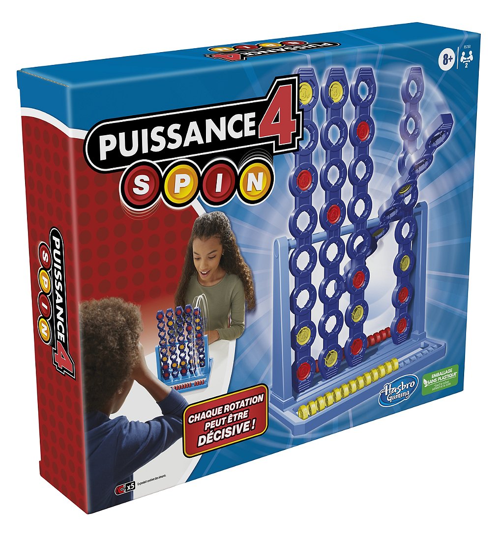 | Plus produit | JEU POUR ENFANTS À PARTIR DE 8 ANS : Suspense, stratégie et surprises seront de mise avec le jeu Puissance 4 Spin, le premier Puissance 4 à grille tournante JEU DE STRATÉGIE AMUSANT : Il faut insérer un pion, puis faire tourner la colonne. Qui sait comment les pions vont s\'aligner ? Les choses peuvent changer en un instant dans ce jeu stratégique de poids et d\'équilibre 4 PIONS EN LIGNE POUR GAGNER : La stratégie est primordiale, mais il faut s\'attendre à des revirements et des victoires surprises ! Le premier joueur à aligner 4 pions horizontalement, verticalement ou diagonalement gagne la partie 2 MODES DE JEU : Ce jeu captivant pour 2 joueurs est idéal pour jouer en famille. Les joueurs peuvent choisir quel défi ils vont relever en choisissant le mode Débutant ou le mode Expert. PIONS LESTÉS : Chaque couleur dispose d\'un pion plus lourd que les autres. Les joueurs peuvent l\'utiliser à tout moment pour acquérir un avantage stratégique |
