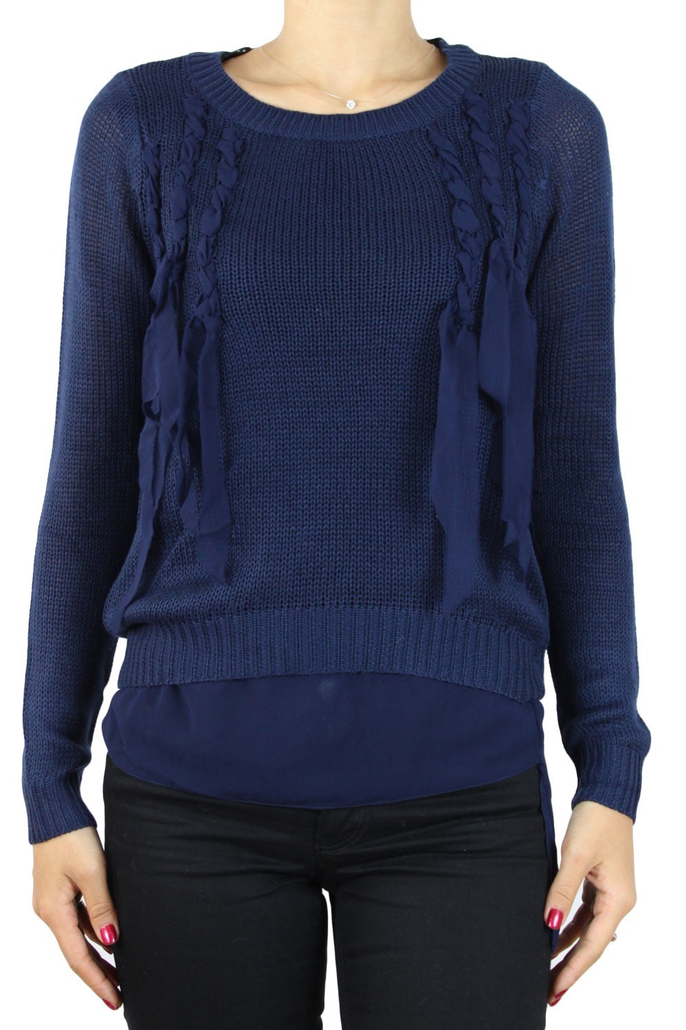 Pull avec un voile a l'intérieur et des franges sur le devant.