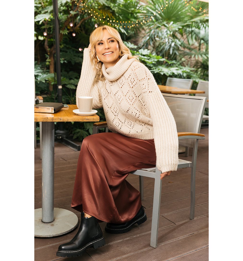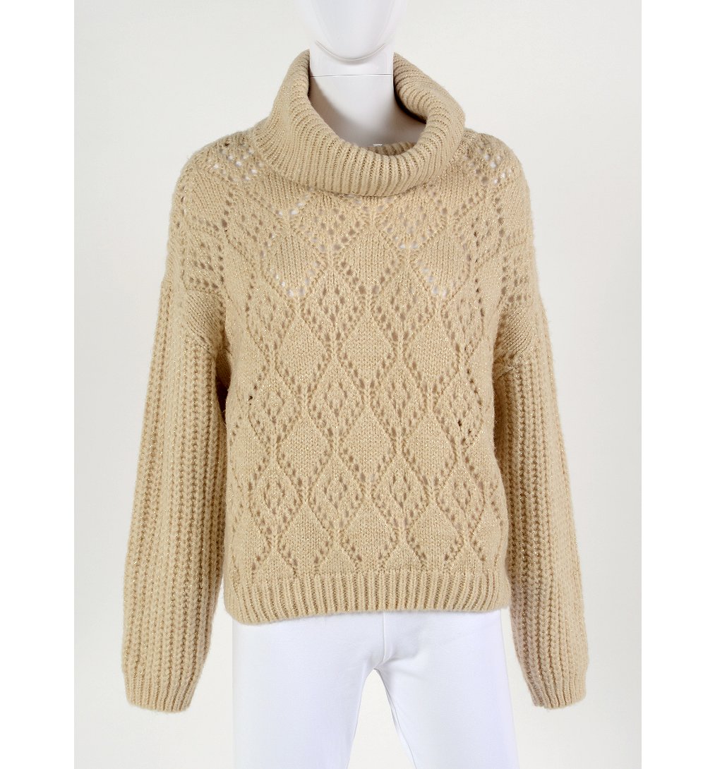 Pull manches longues col roulé avec jeu de points ajourés. Fil mélangé lurex. 54% acrylique 45% polyester 1% fil metalisé