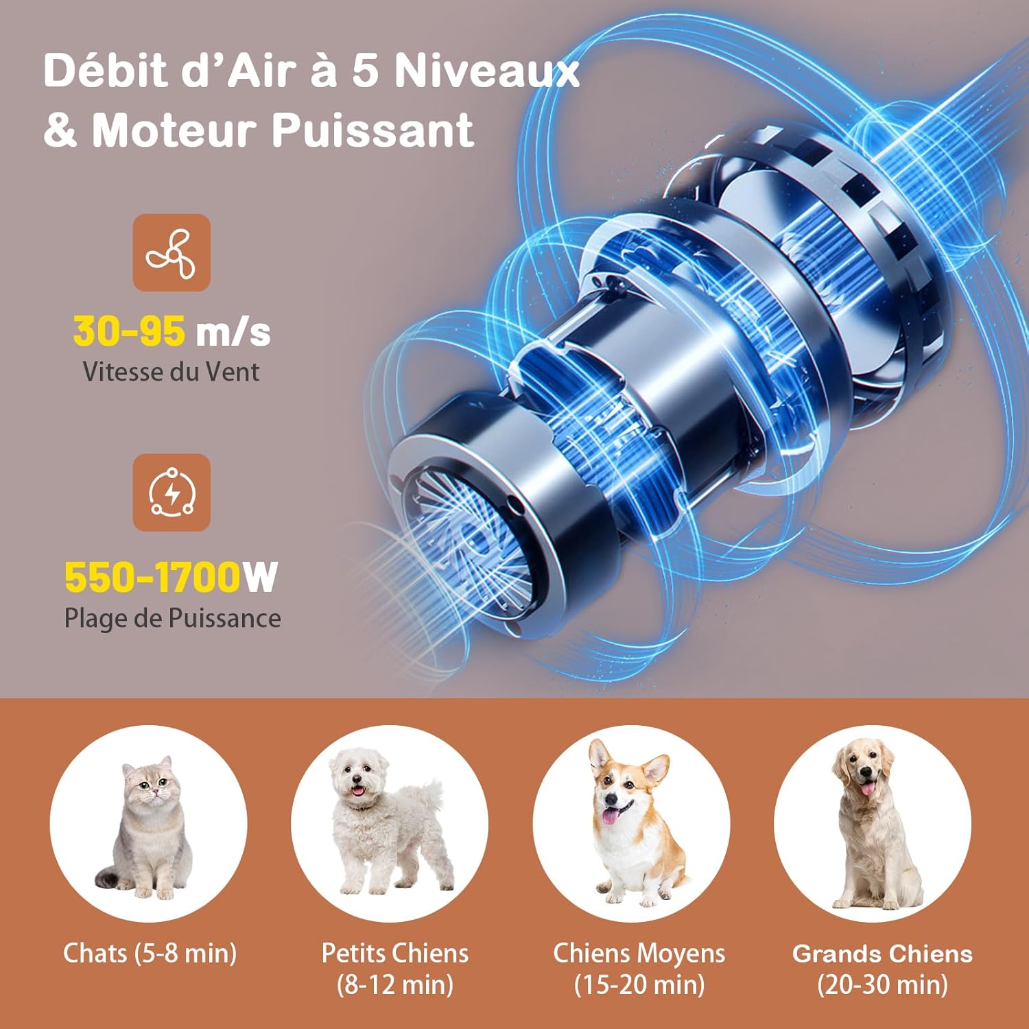 - Détails raffinés : Pour un séchage complet des poils de l'animal, ce sèche-cheveux avec pieds antidérapants offre 4 buses utiles pour le séchage des poils longs, des poils partiels et des poils de pattes. Le raccord verrouillable et le tuyau télescopique garantissent un flux d'air interne régulier et sans fuites.