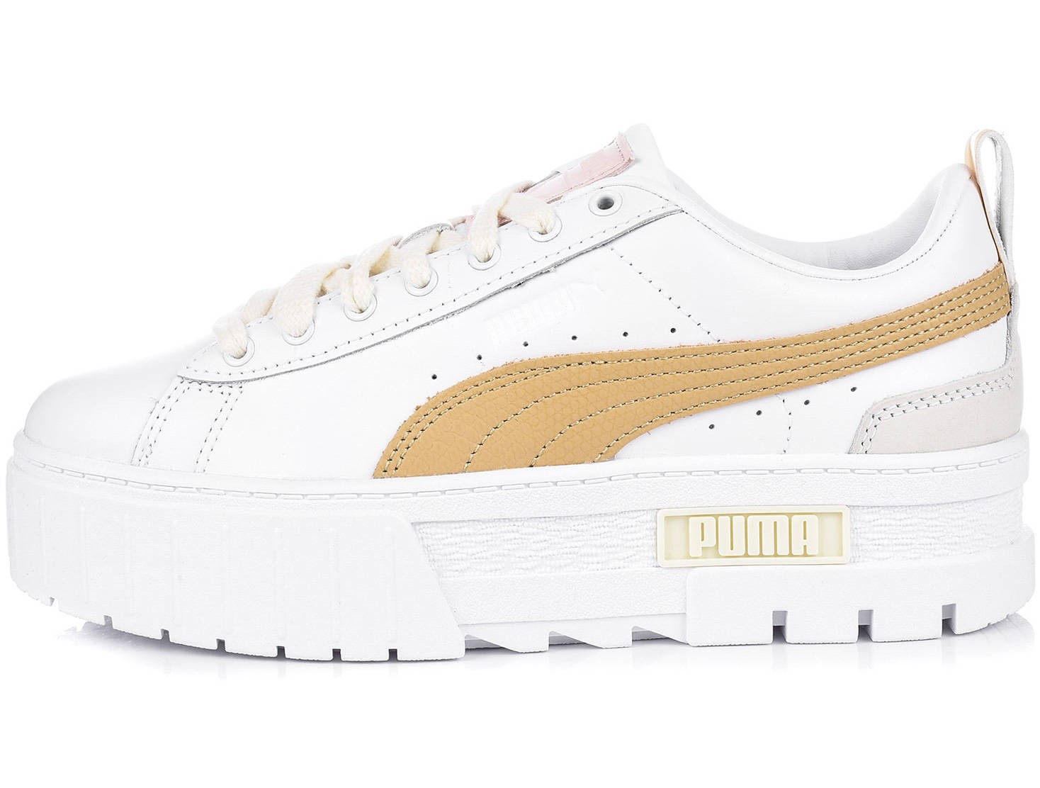 Baskets Puma, modèle Mayze Luxe, sobre avec ses touches de beige et de camel, ultra tendance avec sa semelle compensée !