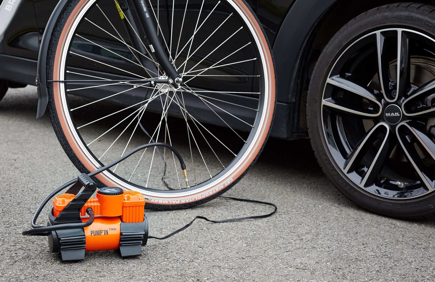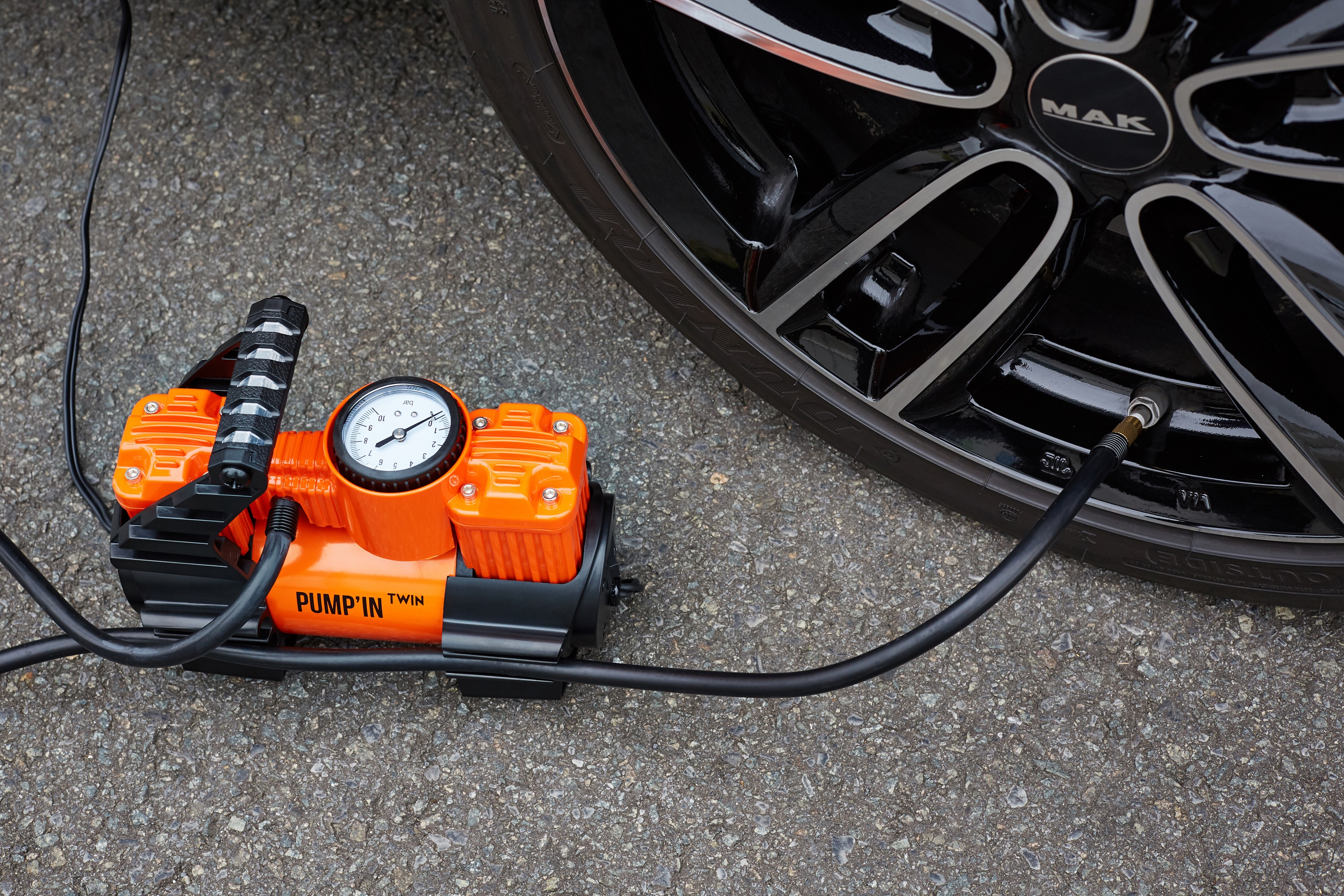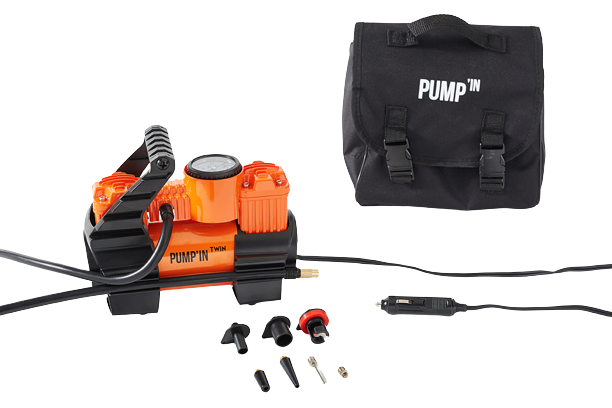 Pump'in TWIN - Mini-compresseur 12V bi-moteur avec accessoires. Alimentation 12V allume-cigare.