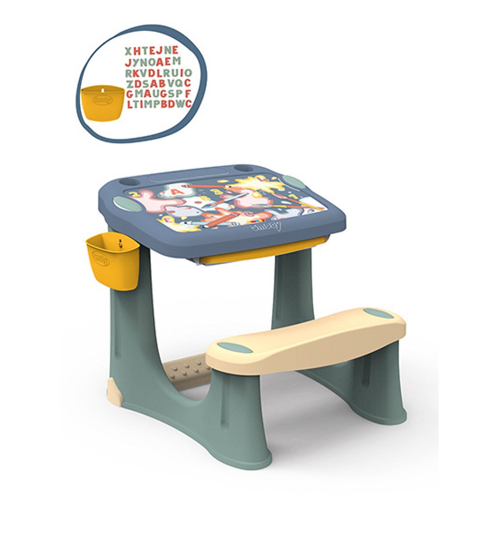 Pupitre en plastique ultra pratique ! 3 espaces pour crayons et peinture et 1 tiroir pour ranger les accessoires en toute autonomie. Accessoires inclus : 48 lettres magnétiques, et bac à lettres