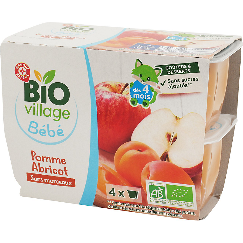 Aliment pour bébés : purée de pommes et abricots - Produit issu de l'agriculture biologique. BIO VILLAGE