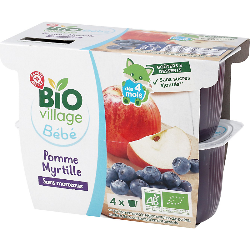 Purée pomme myrtille dès 4 mois bio - 4 x 100 g - BIO VILLAGE