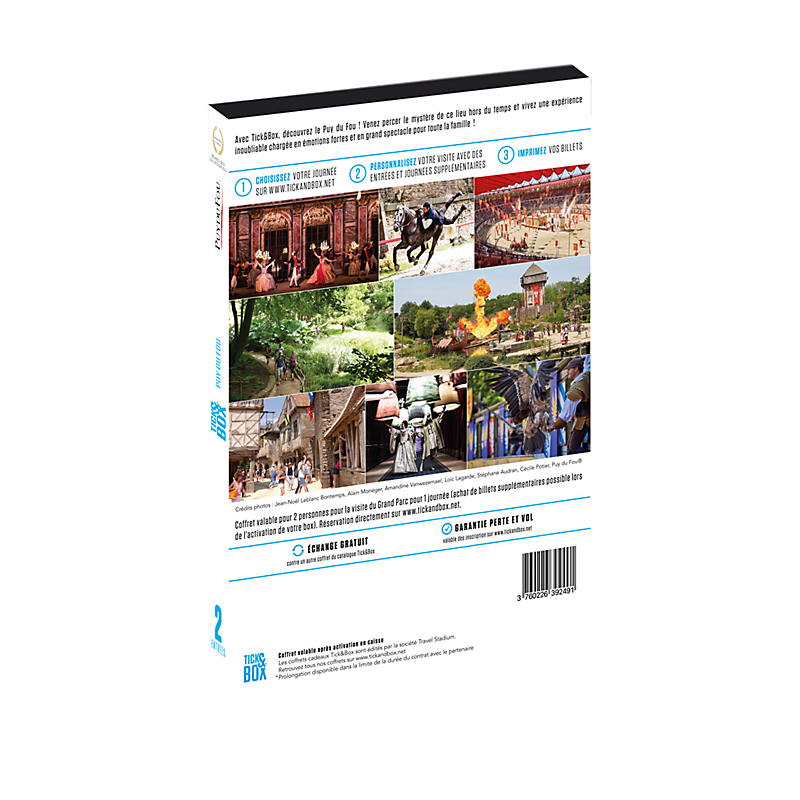 Vivez un inoubliable voyage dans le temps ! Au coeur d'un lieu magique, élu meilleur parc du Monde, laissez-vous transporter par 20 spectacles grandioses et aventures pour toute la famille. Avec Tickn'Box, plongez dans l'univers des plus beaux parcs à thèmes d'Europe. Dans votre Tickn'Box, vous découvrirez : Un chèque cadeau échangeable contre 2 entrées pour une journée. Ce chèque permet de réserver votre séjour en vous connectant sur le site tickandbox.net. Le coffret est valable pour 2 places,24 mois à compter de sa date d’achat. Tickn'Box est revendeur officiel du Puy du Fou. Choisissez votre journée et vivez une expérience unique. Votre séjour est totalement personnalisable lors de votre réservation en ligne (ajout d'entrées ou de journées supplémentaires au meilleur prix du moment)