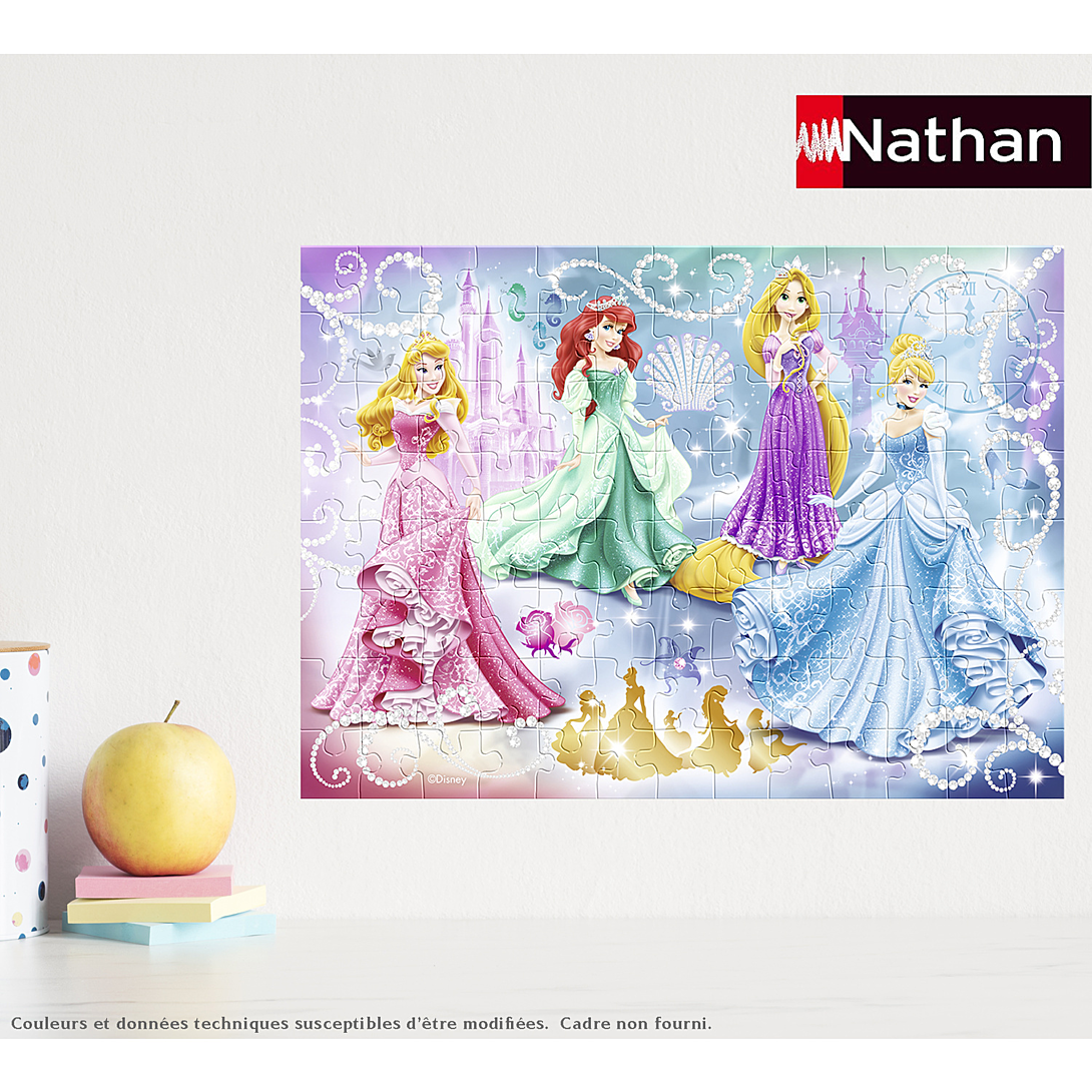 | Plus produit | LUDIQUE ET EDUCATIF : Les puzzles Nathan disposent d\'un trieur de pièces à 3 compartiments dans la boîte, ce qui permet à l\'enfant d\'apprendre à trier plus facilement les pièces par forme et par couleurs. L\'enfant s\'initie à un esprit de logique et apprend la concentration ! Idéal dès 6 ans. PRINCESSES : Un puzzle enchanté avec pleins de princesses c\'est le rêve de tous les enfants ! Retrouvez Cendrillon, Aurore, Raiponce et Ariel vétues de leurs plus belles robes scintillantes ! Dans ce puzzle de 100 pièces, votre enfant developpera ses capacités d\'observation, de réflexion avec ses princesses favorites. CONTENU : 1 puzzle de 100 pièces, avec trieur de pièces inclus. Dimensions du puzzle : 36 x 26 cm. Une qualité de fabrication impeccable : matériau extra-épais et durable résistant aux nombreuses manipulations pour permettre de s\'amuser encore plus longtemps avec son puzzle ! ENVIRONNEMENT : Fabriqué en Europe, ce puzzle est composé de matériaux issus de forêts bien gérées certifiées FSC, de matériaux recyclés et de matériaux issus dautres sources contrôlées (FSC-C111262). De plus, nos puzzles sont garantis 2 ans à compter de la date d\'achat ! UN CADEAU IDEAL pour les enfants dès 6 ans. Les enfants seront ravis de recevoir ce puzzle pour Noël, un anniversaire ou juste pour le plaisir. Il permettra à l\'enfant de s\'initier de manière autonome au puzzle et/ou de permettre aux parents de partager un moment de convivialité et de détente avec leur enfant. |