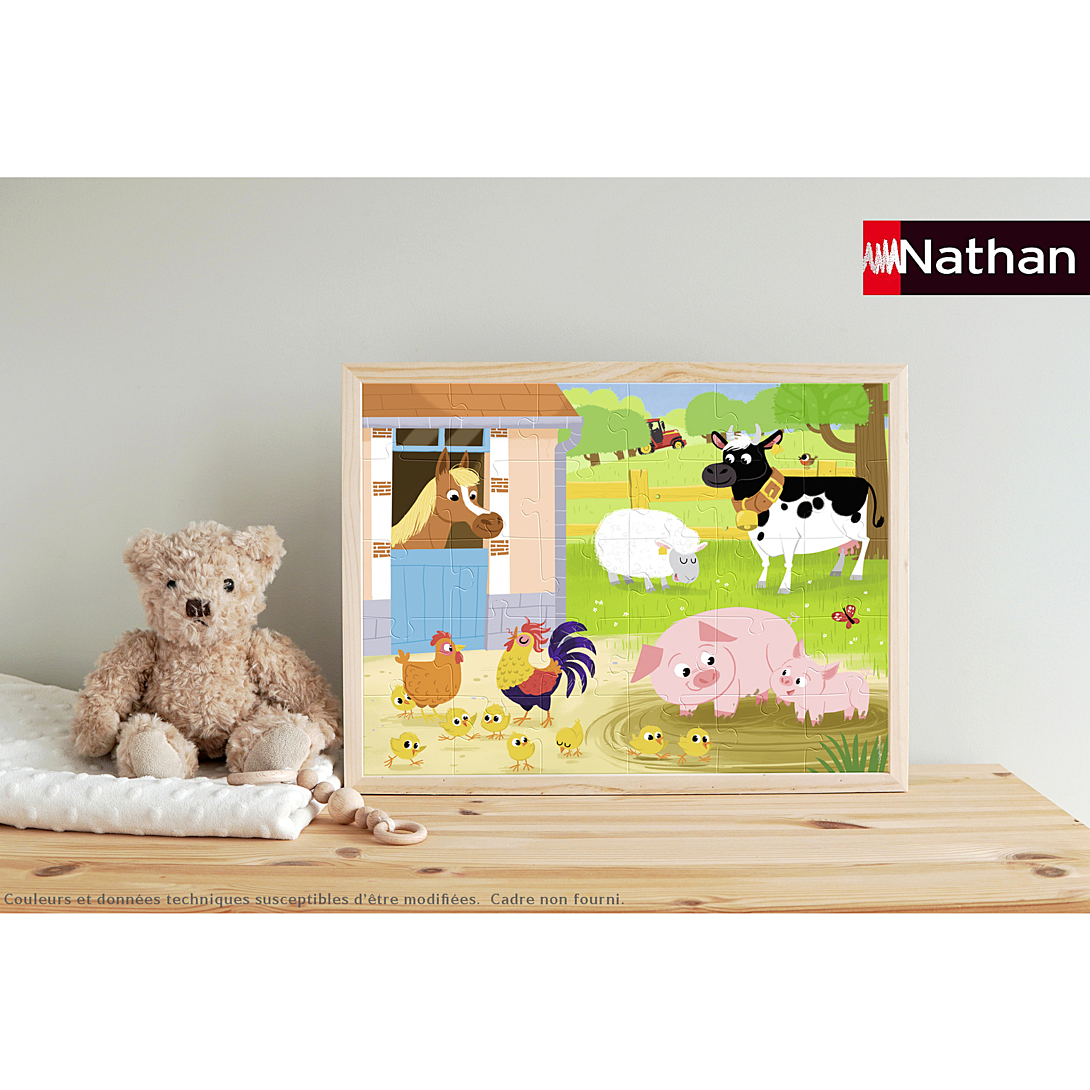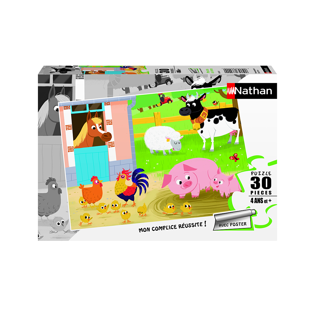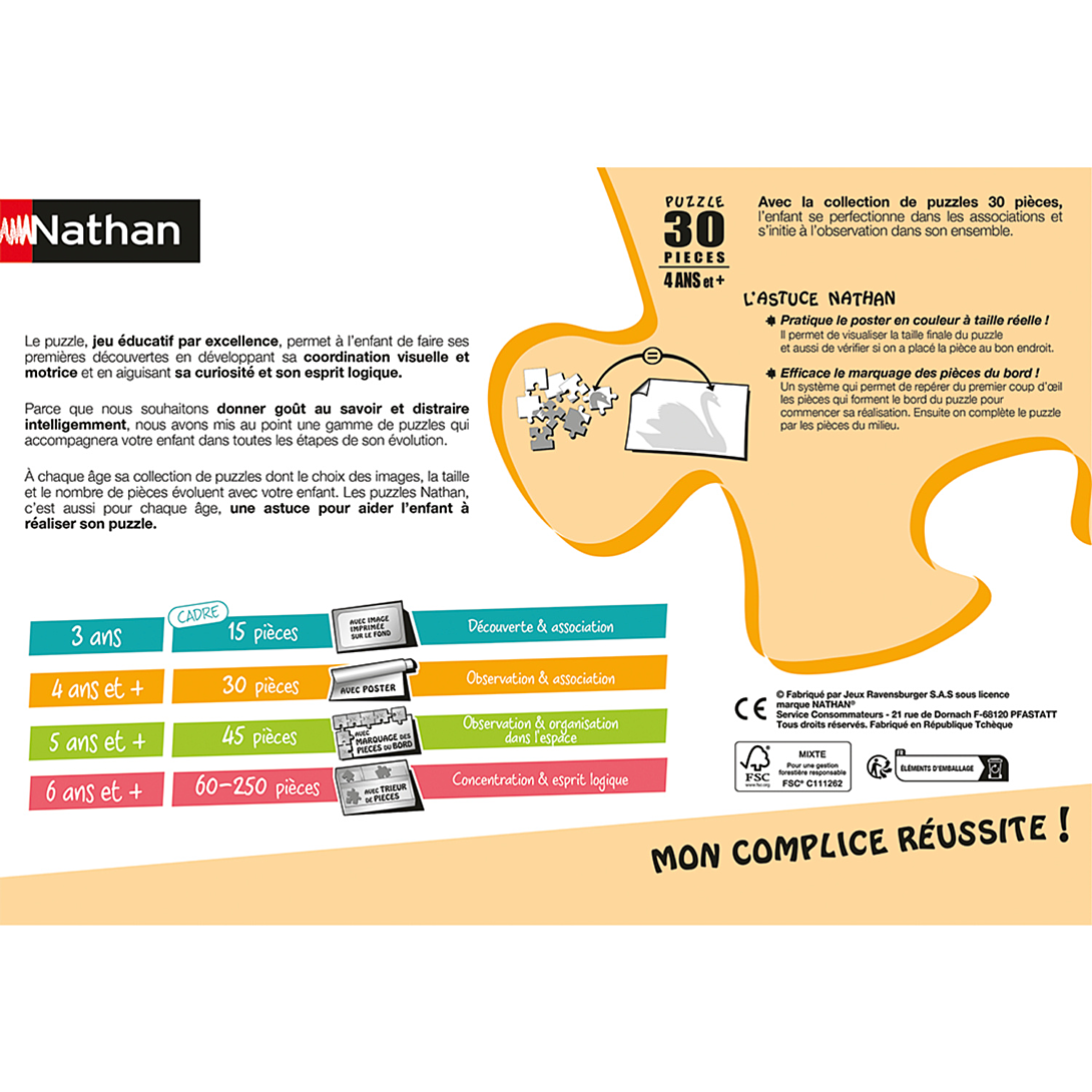 Plus produit LUDIQUE ET EDUCATIF : Les puzzles 30 pièces Nathan permettent à l\'enfant de trouver et d\'associer plus facilement les bonnes pièces grâce au poster à taille réelle en couleurs pour l\'aider à visualiser la taille finale de son puzzle. Les pièces du bord sont marquées au dos pour les repérer au premier coup d\'oeil. Idéal pour les enfants dès 4 ans. LA FERME : Meuh ! Cocorico ! Bêê ! Tous ces bruits sont familiers pour l\'enfant. Découvrez dans ce puzzle, tout l\'univers de la ferme avec les animaux incontournables : le cochon, la vache, le mouton, les poules, le cheval Avec cette illustration mignonne et colorée, votre enfant pourra découvrir en détails l\'univers merveilleux de la ferme. CONTENU : 1 puzzle de 30 pièces et son poster à taille réelle en couleurs comme moyen d\'autocorrection. Les pièces du bord sont marquées au dos pour les repérer plus facilement. Dimensions du puzzle : 30 x 23 cm. SAV : Nos puzzles sont garantis 2 ans à compter de la date d\'achat pour toutes pièces manquantes ! ENVIRONNEMENT : Fabriqué en Europe, ce puzzle est composé de matériaux issus de forêts bien gérées certifiées FSC, de matériaux recyclés et de matériaux issus dautres sources contrôlées (FSC-C111262). Une qualité de fabrication impeccable : matériau extra-épais et durable résistant aux nombreuses manipulations pour s\'amuser encore plus longtemps! UN CADEAU IDEAL pour les enfants dès 4 ans. Les enfants seront ravis de recevoir ce puzzle pour Noël, un anniversaire ou juste pour le plaisir. Il permettra à l\'enfant de s\'initier de manière autonome au puzzle et/ou de permettre aux parents de partager un moment de convivialité et de détente avec leur enfant.