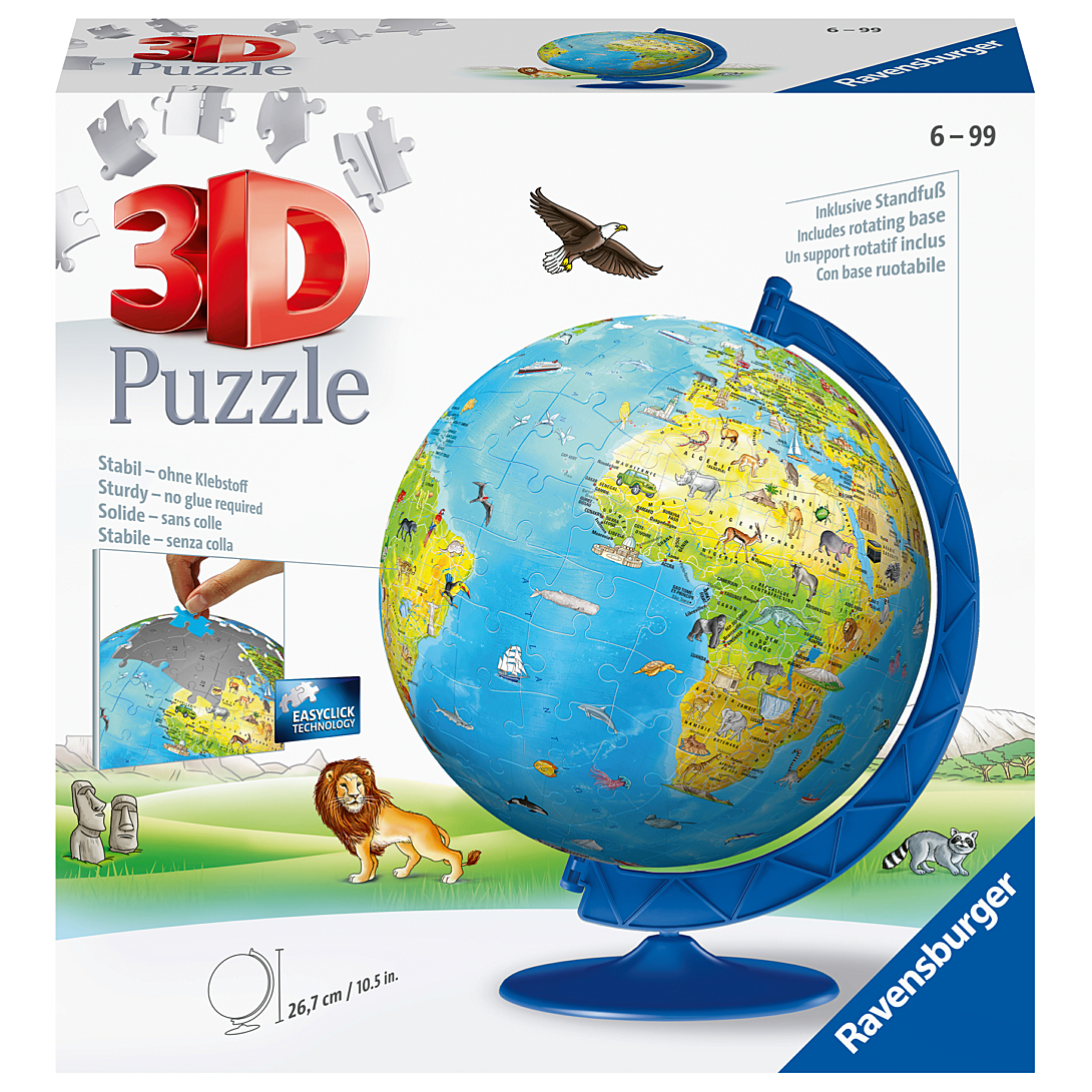 | Plus produit | UN PUZZLE EDUCATIF EN 3 DIMENSIONS : Une façon ludique d\'apprendre la géographie grâce à ce puzzle globe en français ! Il est composé de 180 pièces de plastique numérotées et incurvées qui s\'assemblent facilement en suivant l\'ordre des numéros des pièces. Contenu : 1 puzzle 3D de 180 pièces en forme de sphère, support rotatif et notice inclus. GLOBE TERRESTRE : Ce puzzle offrira aux filles comme aux garçons de 6 ans ou plus, une expérience ludique avec un puzzle original et rédigé en français pour apprendre en détails les noms des océans, des continents, des pays et des capitales de notre Terre ! HAUTE QUALITE : La technologie Easyclick et la qualité de découpe des pièces permettent un encastrement parfait et assure ainsi la solidité du puzzle 3D, le tout SANS la moindre COLLE ! La taille des 180 pièces numérotées permet à l\'enfant de construire son puzzle en toute autonomie et de développer ses facultés de concentration. Diamètre : 20 cm. UN CADEAU IDEAL pour tous les passionés de géo ! Ce puzzle 3D peut s\'assembler seul ou à plusieurs pour partager un moment de convivialité en famille ou entre amis. Un cadeau parfait pour décorer sa chambre d\'enfant, ou pour toute autre occasion : Noël, un anniversaire ou juste pour le plaisir ! ENVIRONNEMENT : Fabriqué en Europe, ce puzzle est composé de matériaux issus de forêts bien gérées certifiées FSC, de matériaux recyclés et de matériaux issus dautres sources contrôlées (FSC-C111262 , FSC : organisme à but non lucratif qui protège, contrôle et encourage la gestion durable des forêts). |