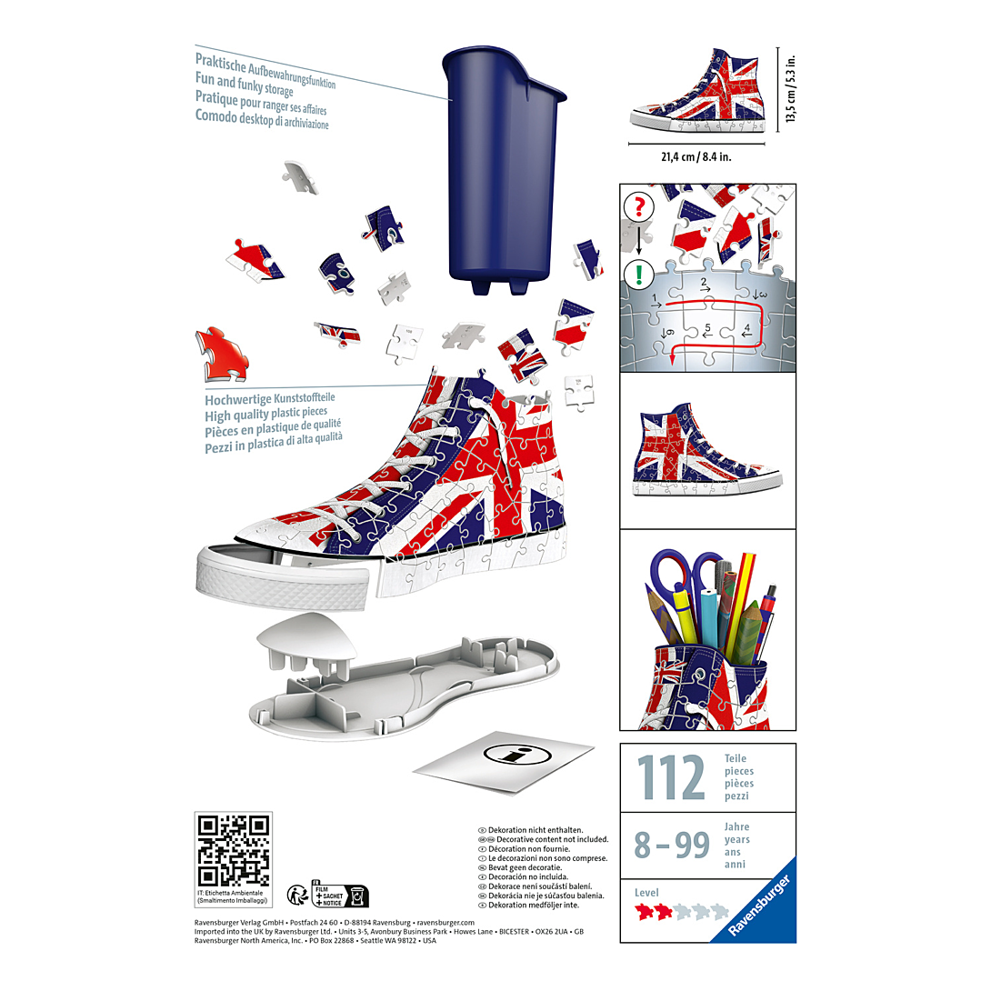 Plus produit UN PUZZLE EN 3 DIMENSIONS composé de 108 pièces de plastique numérotées et d\'accessoires uniques pour finaliser la sneaker. Elle s\'assemble facilement en suivant l\'ordre des numéros des pièces et se transforme en magnifique pot à crayons. Contenu : 1 puzzle 3D de 108 pièces en forme de sneaker et ses accessoires. Hauteur du puzzle monté : 13,5 cm. UNION JACK : Ce puzzle offrira aux filles comme aux garçons de 8 ans ou plus, une expérience ludique avec un puzzle original qui se transforme en pot à crayons. Avec sa forme très tendance en forme de basket et son motif aux couleurs du drapeau anglais, ce puzzle donnera un look fantastique à n\'importe quelle chambre ! HAUTE QUALITE : La technologie Easyclick et la qualité de découpe des pièces permettent un encastrement parfait et assure ainsi la solidité du puzzle 3D, le tout SANS la moindre COLLE ! La taille des pièces numérotées permet à l\'enfant de construire son puzzle en toute autonomie et de développer ses facultés de concentration. UN CADEAU IDEAL pour tous les fans du Royaume-Uni ! Ce puzzle 3D peut s\'assembler seul ou à plusieurs pour partager un moment de convivialité en famille ou entre amis. Un cadeau parfait pour décorer sa chambre d\'enfant, ou pour toute autre occasion : Noël, un anniversaire ou juste pour le plaisir ! ENVIRONNEMENT : Fabriqué en Europe, ce puzzle est composé de matériaux issus de forêts bien gérées certifiées FSC, de matériaux recyclés et de matériaux issus dautres sources contrôlées (FSC-C111262 , FSC : organisme à but non lucratif qui protège, contrôle et encourage la gestion durable des forêts).