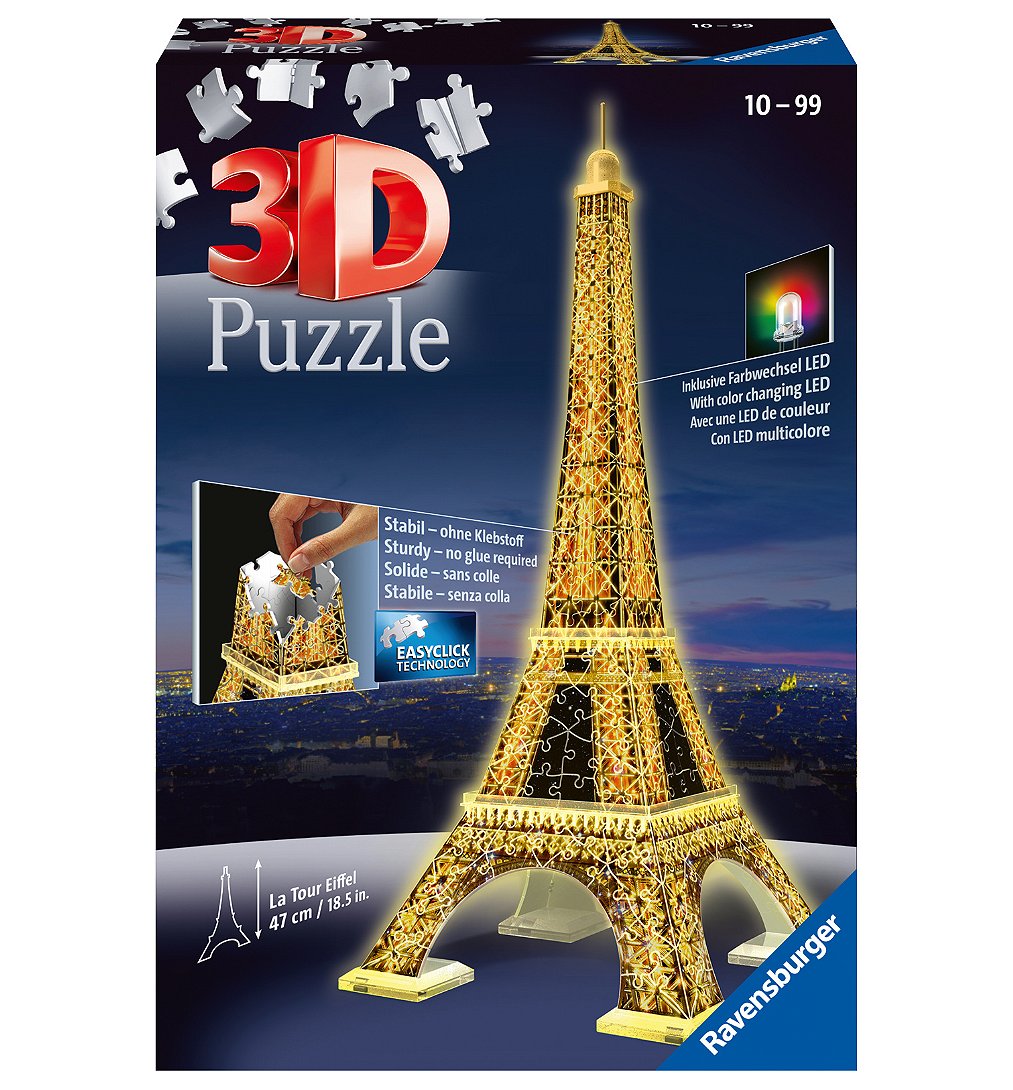 Cette superbe reproduction en 3D de la Tour Eiffel est constituée de 216 pièces de puzzles en plastique numérotées, ainsi que d'accessoires uniques pour finaliser l'édifice. La qualité de découpe des pièces -plates, incurvées ou pliables- lui assure une parfaite stabilité, le tout sans colle. Une fois assemblé, l'édifice s'illumine grâce à un éclairage intégré, avec plusieurs modes au choix : blanc tamisé, ou bien avec une alternance de couleurs. Un moyen unique et ludique de re-découvrir ce célèbre monument !
