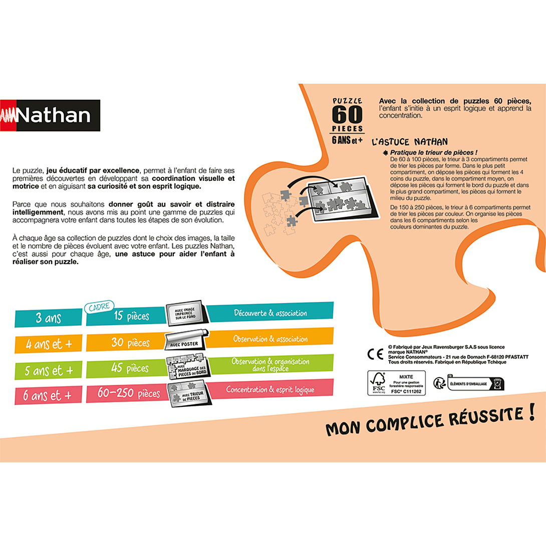 Le puzzle 60 pièces est un format idéal pour évoluer dans l'univers de ses héros préférés, dès 6 ans. Le petit plus Nathan, c'est le trieur de pièces à 3 compartiments, pour classer les pièces selon leurs formes.