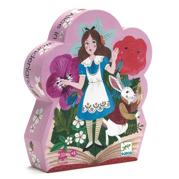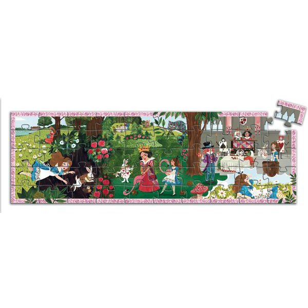 un magnifique puzzle de 50 pièces pour les enfants à partir de 5 ans qui raconte l'histoire d'Alice dans un format paysage.