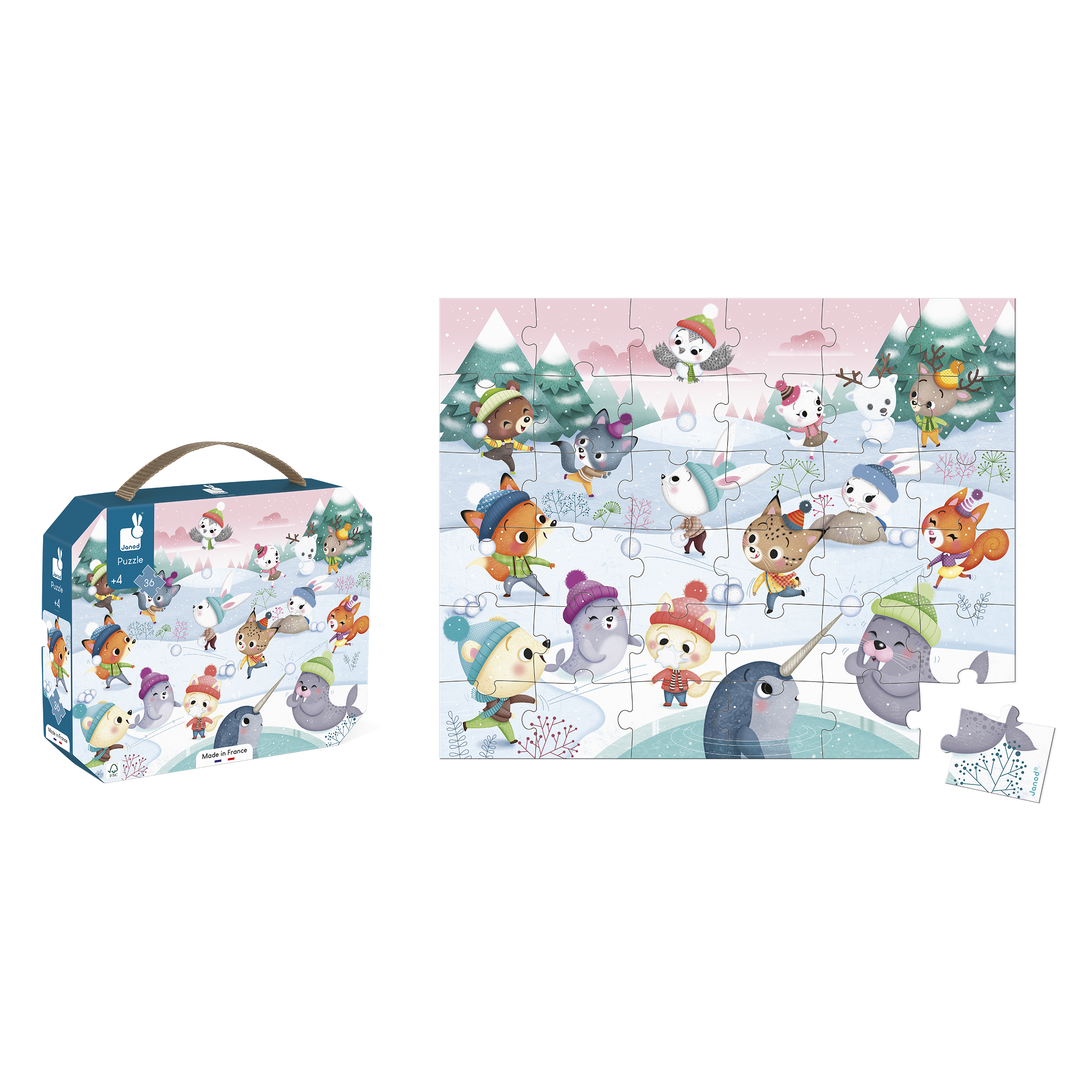 Pour s'amuser à regarder les animaux faire une bataille de boule de neige, tout en développant sa mémoire et dextérité, voici un beau puzzle en carton de 36 pièces. Dans sa jolie valisette, ce puzzle sera facile à transporter grâce à sa poignée en tissu. Contient un poster servant de modèle pour les débutants, les plus aguerris pourront ensuite réaliser le puzzle en toute autonomie. Fabriqué en France, produit FSC et à base d'encres végétales.