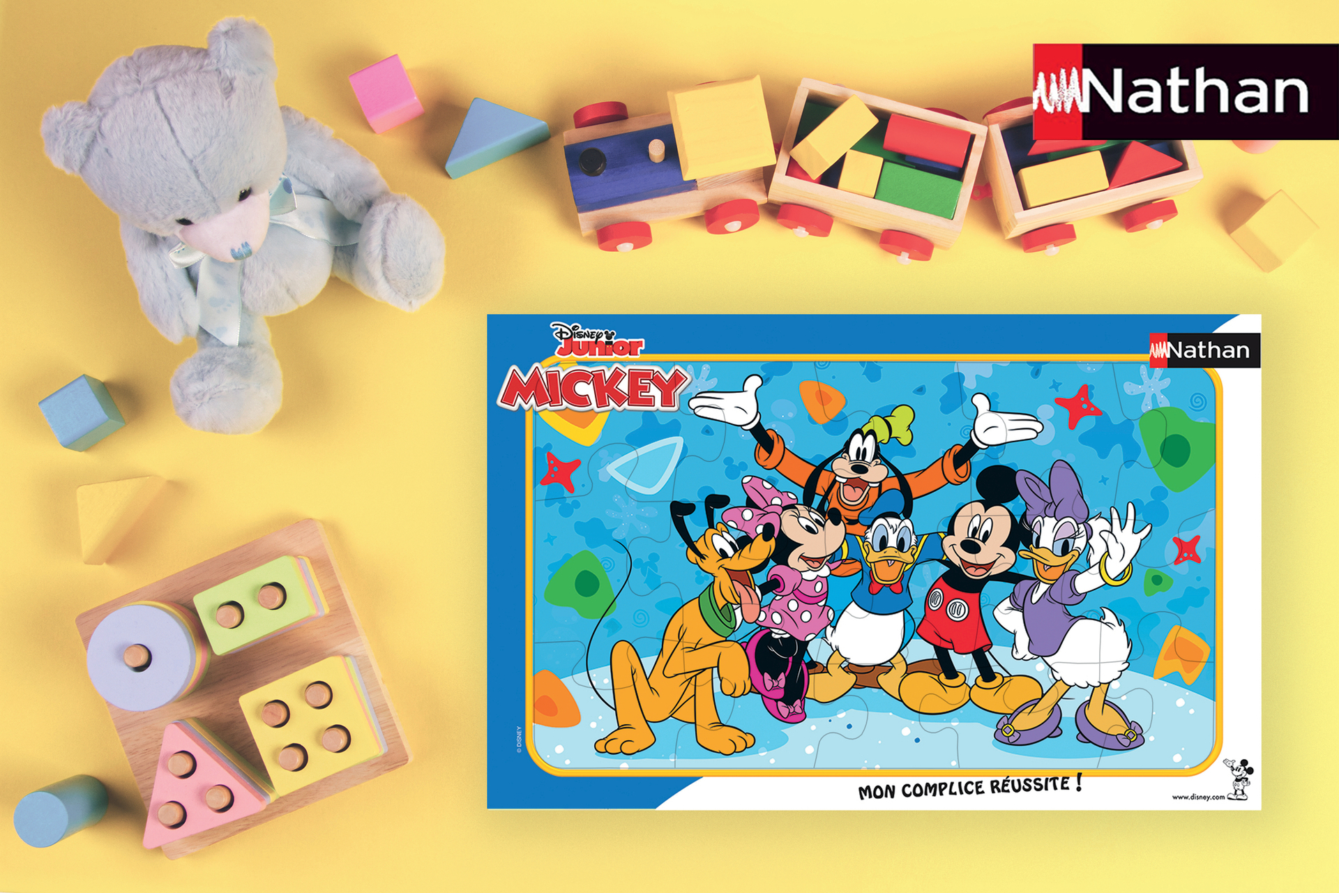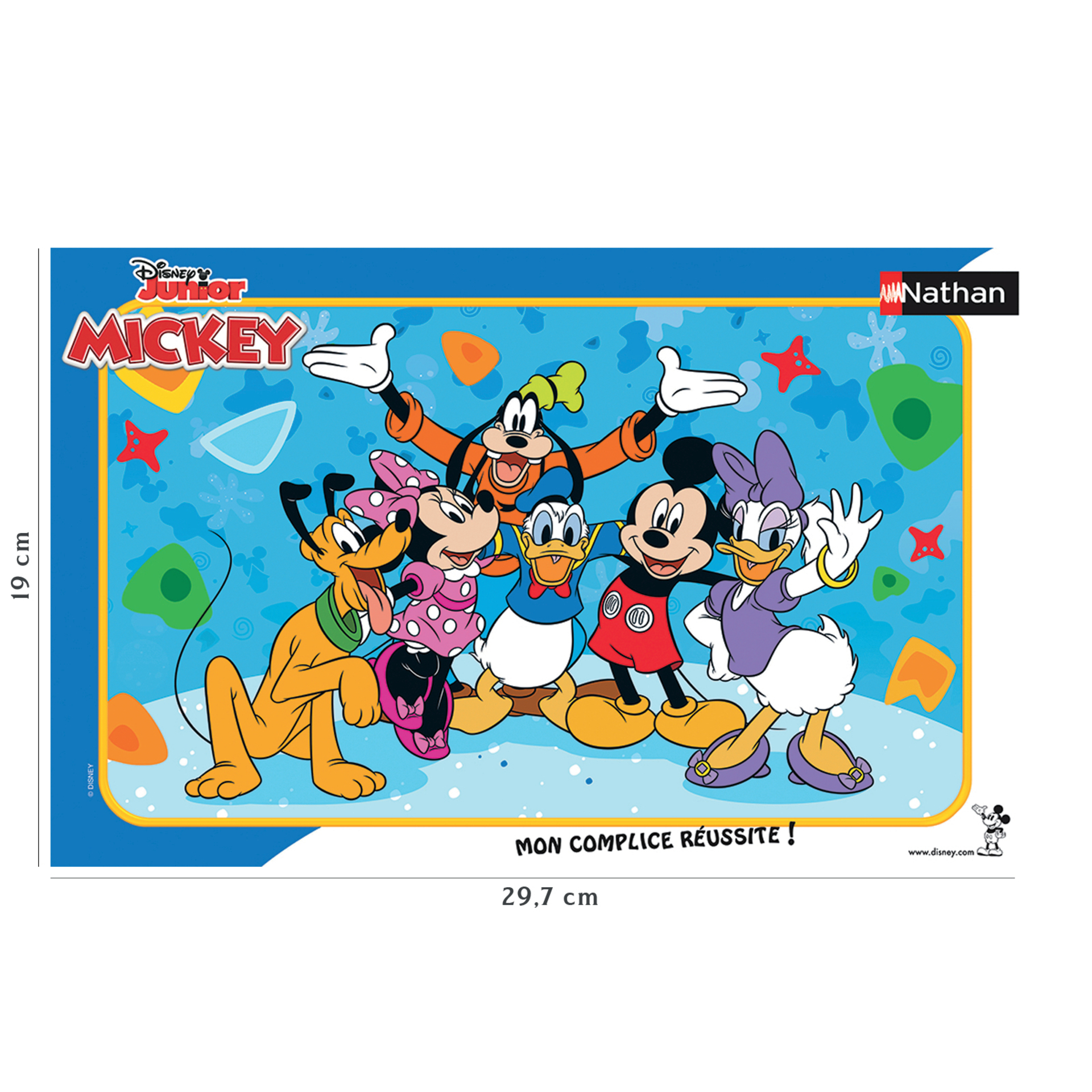| Plus produit | LUDIQUE ET EDUCATIF : Les puzzles cadres Nathan permettent à l\'enfant de trouver et d\'associer plus facilement les bonnes pièces sur le fond du cadre grâce à l\'image imprimée et aux lignes de découpe qui y sont gravées. L\'enfant découvre en toute autonomie dès 3 ans le principe d\'association, et développe sa motricité et sa concentration. MICKEY MOUSE : Retrouvez Mickey Mouse et tous ses amis, en commençant par Minnie Mouse sa partenaire de toujours, Donald et Daisy, les canards les plus connus, Dingo et Pluto, le chien de Mickey. Cette bande d\'amis a vécu de grandes aventures au travers des années et vu grandir de nombreuses générations fans de l\'univers de Disney. CONTENU : 1 puzzle de 15 pièces, 1 cadre avec l\'image du puzzle imprimée et les lignes de découpe gravées dans le fond. Dimensions du puzzle : 25 x 14,5 cm (dimensions avec cadre : 29,5 x 19 cm). SAV : Nos puzzles sont garantis 2 ans à compter de la date d\'achat pour toutes pièces manquantes ! ENVIRONNEMENT : Fabriqué en Europe, ce puzzle est composé de matériaux issus de forêts bien gérées certifiées FSC, de matériaux recyclés et de matériaux issus dautres sources contrôlées (FSC-C111262). Une qualité de fabrication impeccable : matériau extra-épais et durable résistant aux nombreuses manipulations pour s\'amuser encore plus longtemps! UN CADEAU IDEAL pour les enfants dès 3 ans. Les enfants seront ravis de recevoir ce puzzle pour Noël, un anniversaire ou juste pour le plaisir. Il permettra à l\'enfant de s\'initier de manière autonome au puzzle et/ou de permettre aux parents de partager un moment de convivialité et de détente avec leur enfant. |