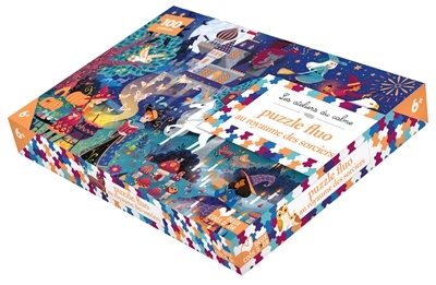 Une boîte contenant 100 pièces de puzzle sur le thème des sorciers et des sorcières avec un effet fluo orange sur la boîte et le puzzle pour plus de sorcellerie, idéal pour Halloween ! Cette activité permettra à l'enfant d'exercer sa concentration et sa patience en assemblant les pièces du puzzle tout en s'amusant !