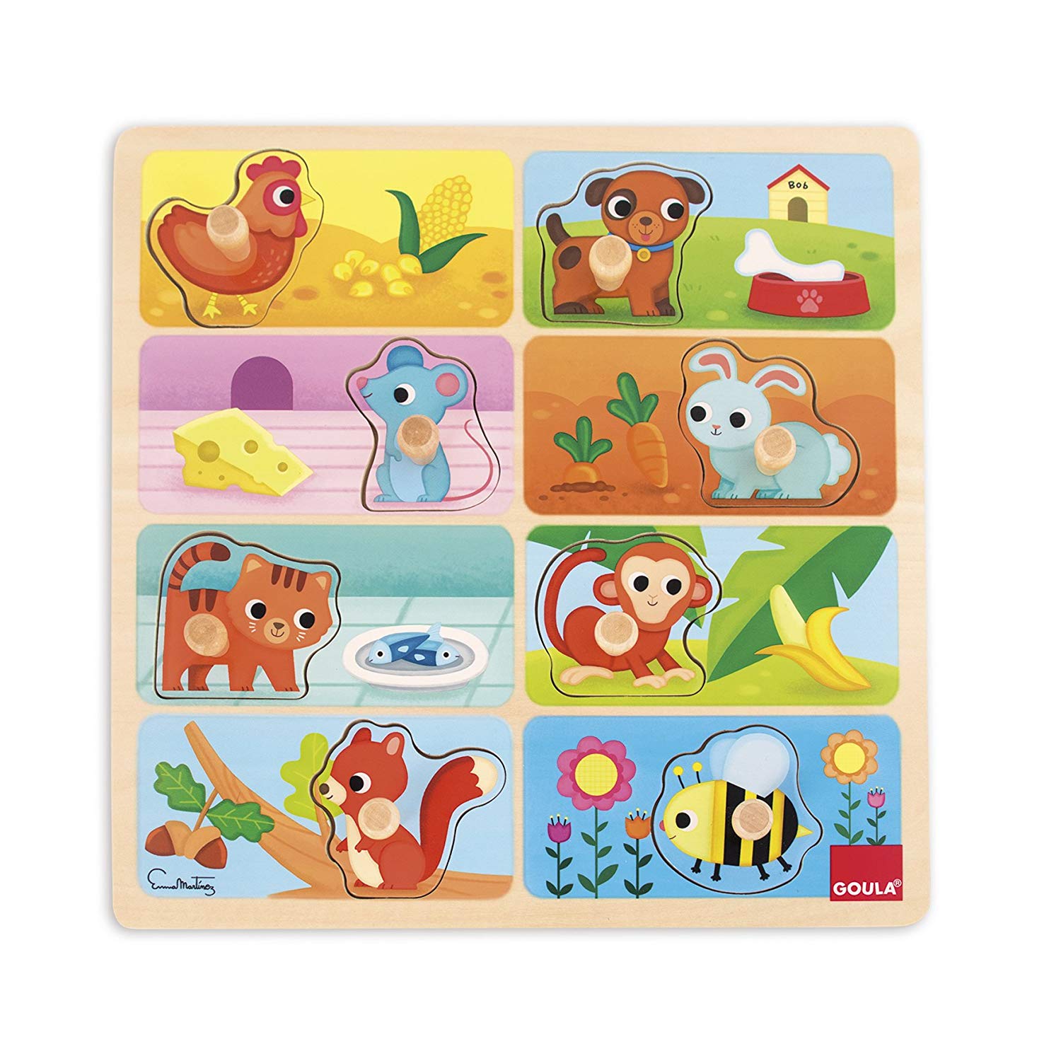 Miam, Miam... Ce puzzle d'encastrement en bois propose d'associer chaque animal à sa nourriture préférée ! Votre enfant sera guidé par la silhouette des animaux.
