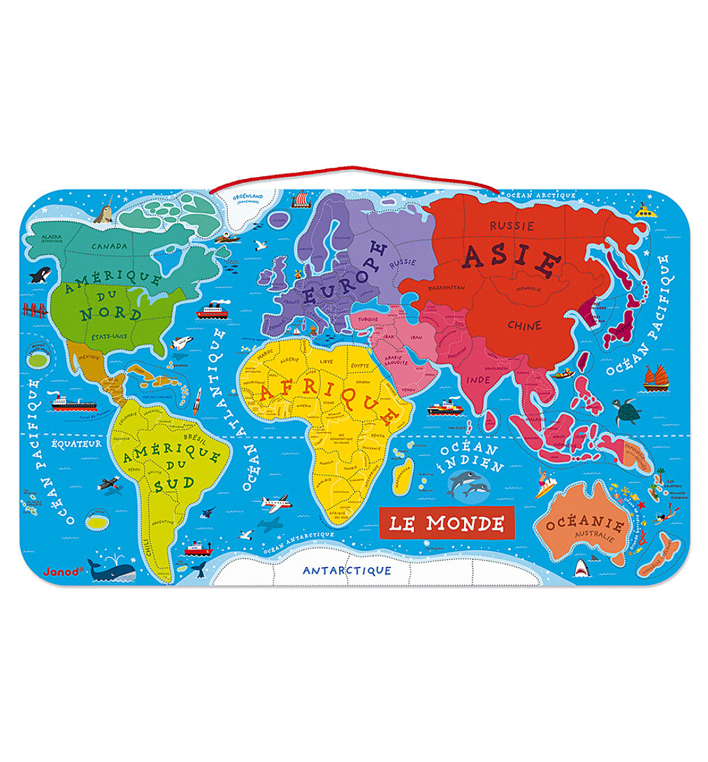 Le tour du monde en 92 magnets ! Chaque magnet représente un pays ou une région du monde, avec son nom, sa capitale et une illustration caractérisant cette partie du globe. Le grand tableau magnétique représente le monde avec ses continents, ses mers, ses océans : la couleur utilisée pour chaque région permet de se repérer. Amuse-toi à remettre chaque pays à sa place, tu obtiendras un magnifique puzzle magnétique du monde que tu pourras accrocher au mur. Une façon ludique et pédagogique de découvrir la planète. En route pour le tour du monde en 92 magnets ! Bois : MDF (plateau) + contreplaqué (magnets). Ficelle en coton. Livré filmé avec sticker avant et étiquette à l'arrière