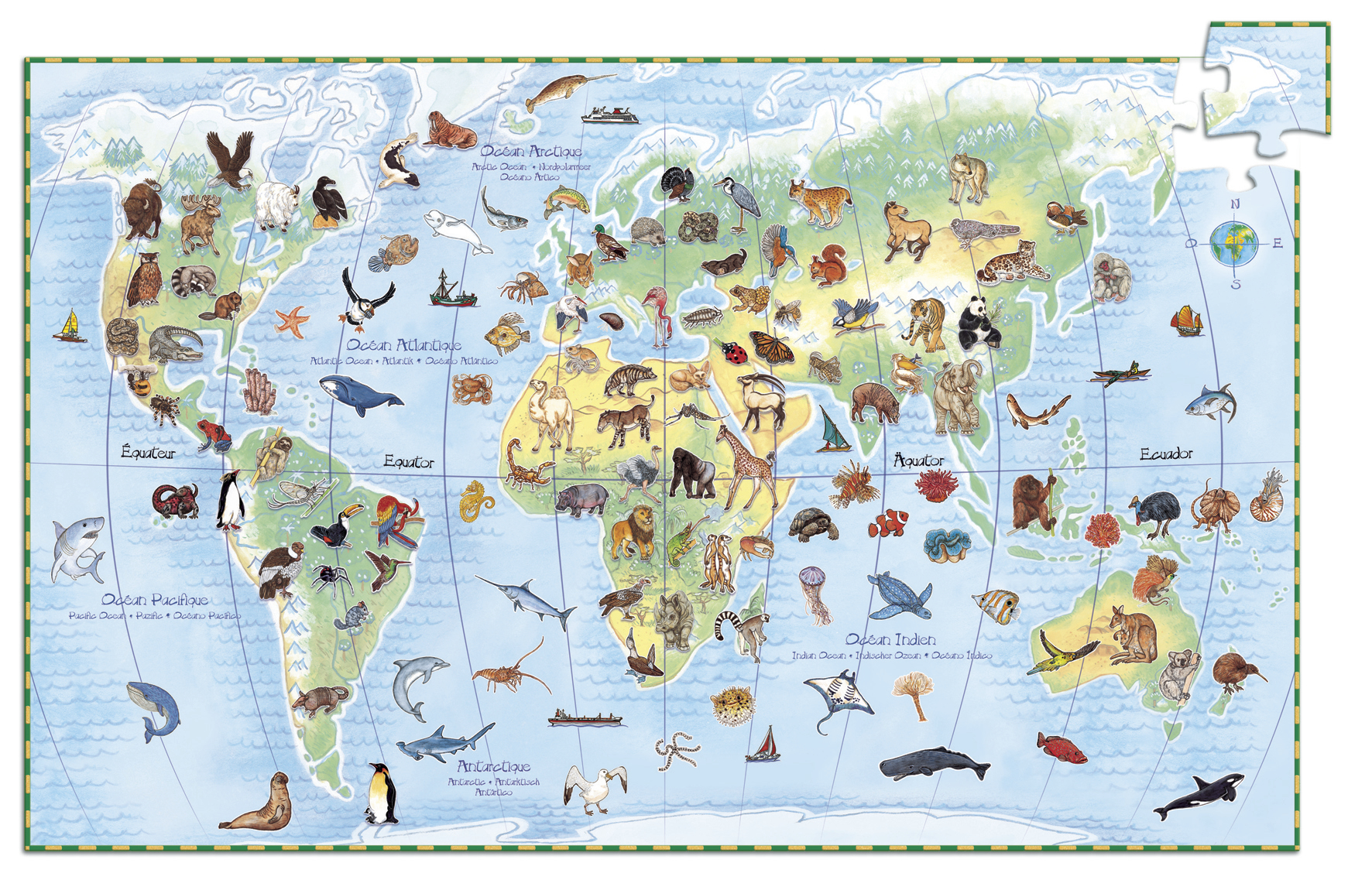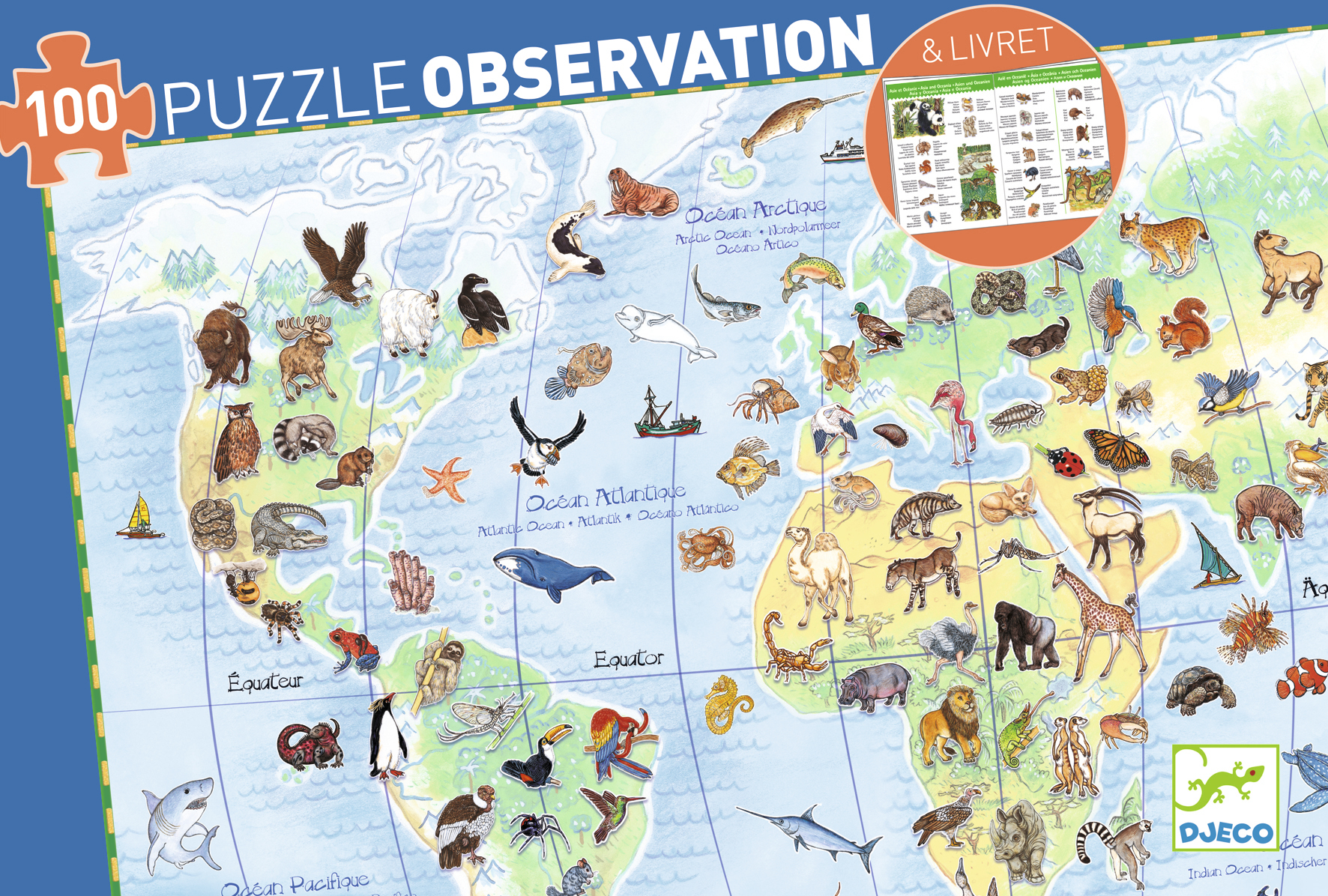 Découvre les animaux du monde en t’amusant! Un puzzle de 100 pièces, un poster et un livret pour apprendre le nom des animaux et les régions du monde où ils vivent.