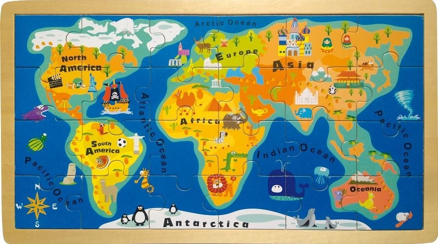 Cette carte du monde aux dessins enfantins composée de 24 pièces de puzzle donne aux petits leurs premières notions de géographie, tout en leur enseignant la langue anglaise.