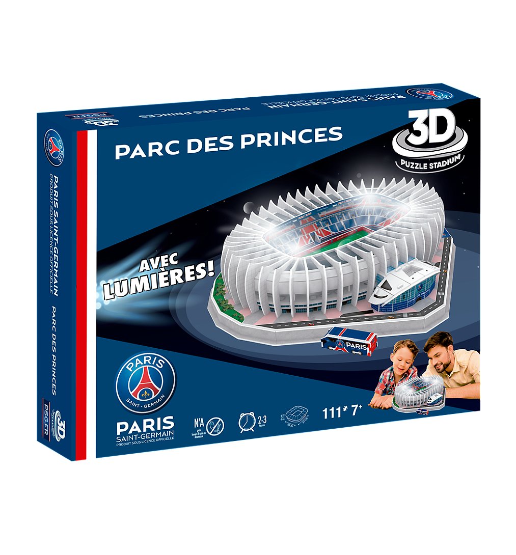 PUZZLE 3 D LED PSG PARC DES PRINCES, réalise chez toi le stade de l’équipe du PSG en 3D avec des LED ! ● Assemble les 111 pièces du puzzle pour construire le stade de foot PARC DES PRINCES ! ● L’éclairage d’ambiance par les 6 LED intégrées sublimera le stade ! ● Ce produit conçu avec un matériel robuste, amusant à monter seul, en famille ou entre amis, permet aux enfants dès l’âge de 7 ans de stimuler leur créativité et leur dextérité ! ● Montage sans outils et sans colle ● Dimensions du puzzle monté : 35 x 30 x 7 cm