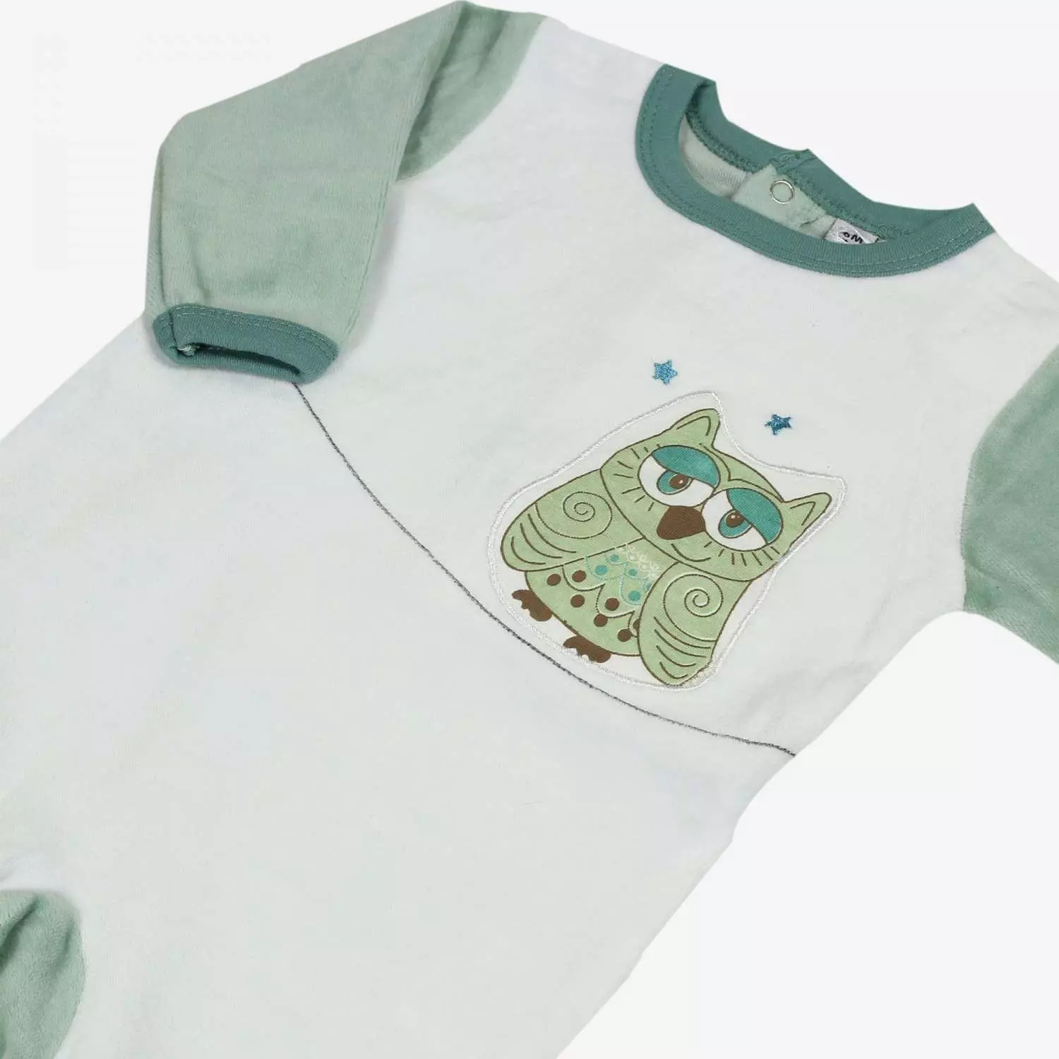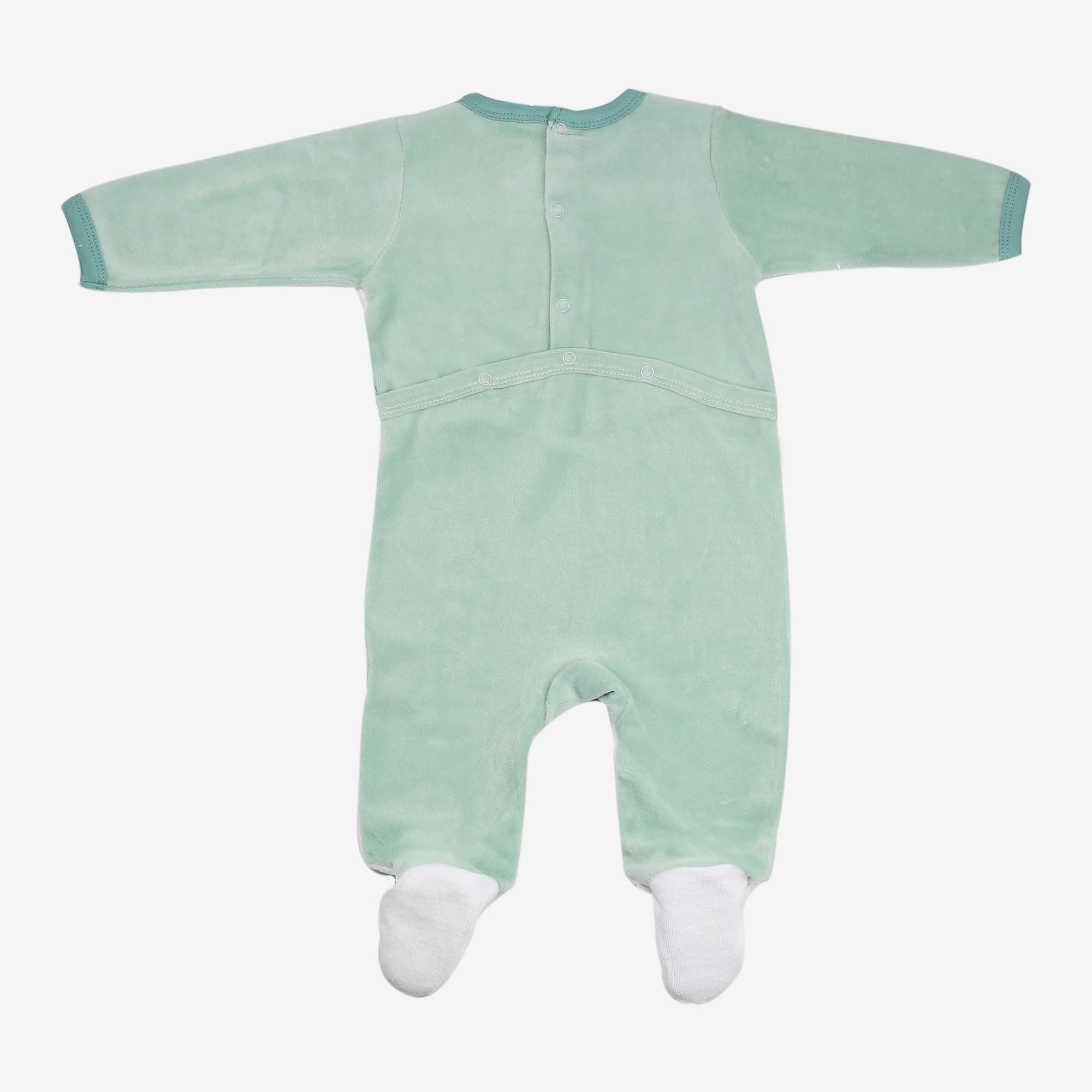 Cette grenouillère bébé garçon en velours blanc et vert sublimera les nuits de votre petit bout et lui apportera un maximum de confort. Le dos est entièrement bleu gris. Son animation sur l'avant accompagnera votre bout d'chou dans ses plus beaux rêves. Les boutons pressions placés sur l'arrière seront pratique pour habiller bébé dès 6 mois. Avec sa matière chaude, ses manches longues et les pieds fermés, vous êtes certains que bébé n'aura pas froid.