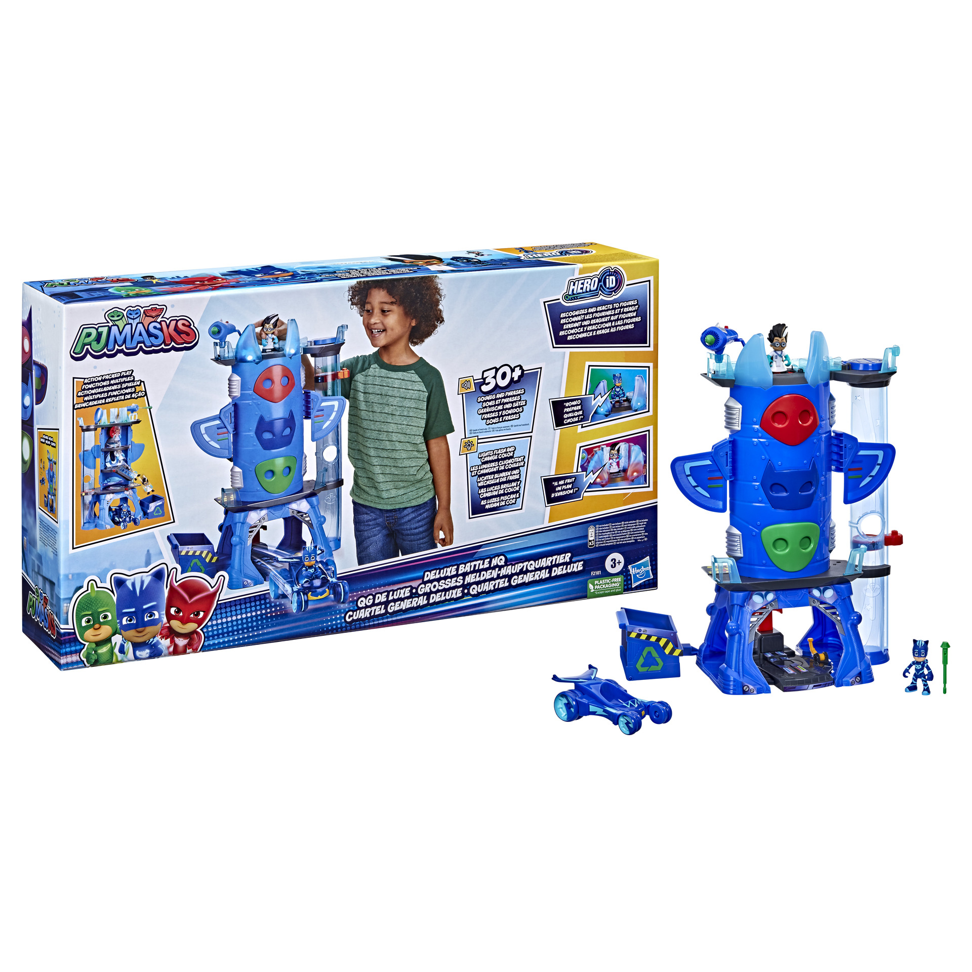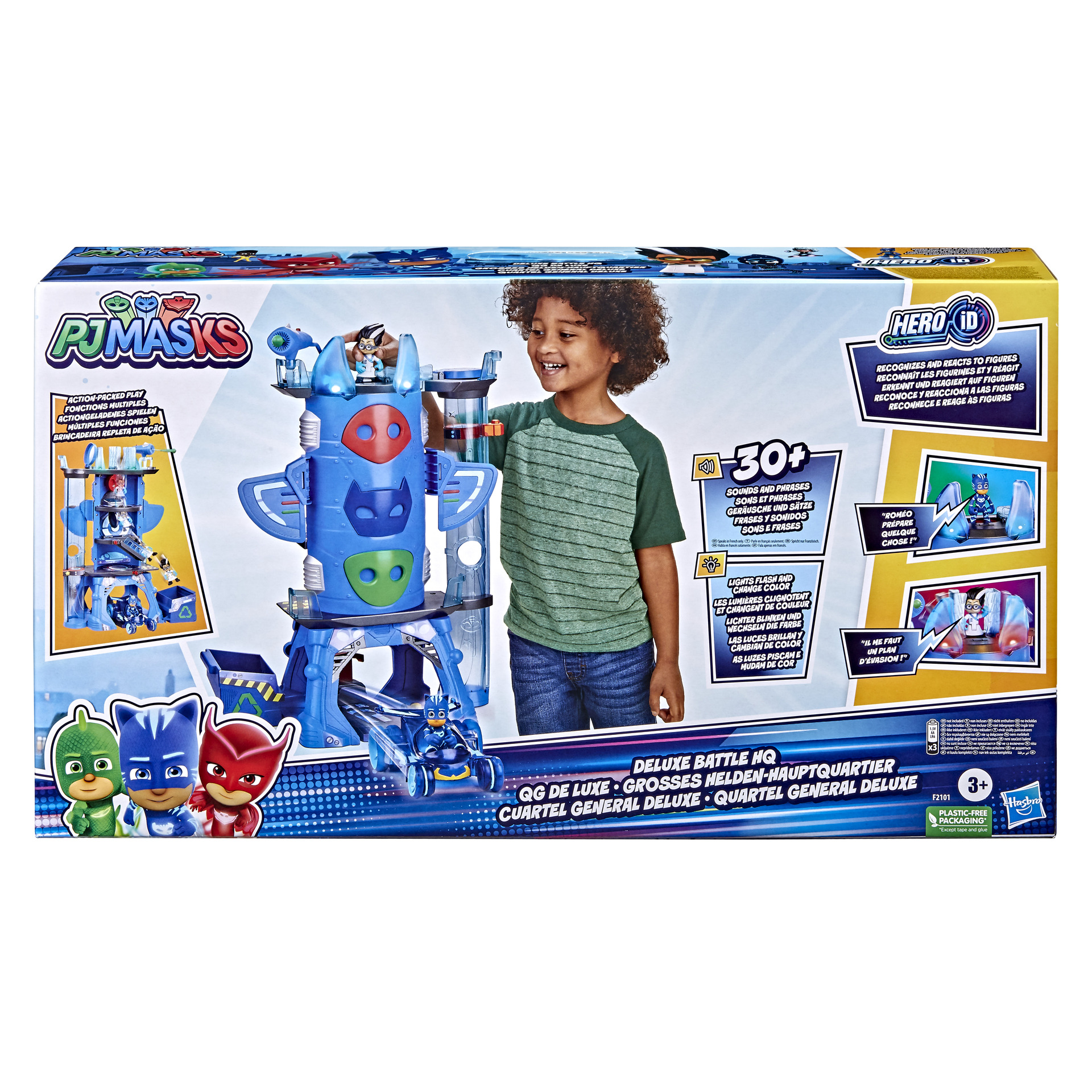 | Plus produit | L\'ULTIME QUARTIER GÉNÉRAL DES PYJAMASQUES : Le coffret Pyjamasques QG de luxe a plusieurs fonctions captivantes, dont des sons et des lumières ! Le coffret inclut 2 figurines et un véhicule Pyjamasques SONS ET LUMIÈRES ACTIVÉS PAR LA TECHNOLOGIE HERO ID : La technologie Hero ID de Hasbro reconnaît les figurines Pyjamasques compatibles et sait s\'il s\'agit de héros ou de méchants. La technologie active aussi des sons et des lumières propres au personnage COFFRET PYJAMASQUES REMPLI D\'ACTION : Ce QG des Pyjamasques à plusieurs étages est équipé d\'un lance-véhicule, d\'un piège à méchants, d\'une sortie secrète, d\'un ascenseur et d\'un lance-projectile 2 FIGURINES PYJAMASQUES : Ce coffret de jeu Pyjamasques inclut les figurines Roméo et Yoyo VÉHICULE DE YOYO : On peut lancer le véhicule de Yoyo dans l\'action avec le lance-véhicule ! On peut assoir les figurines dans le véhicule pour s\'amuser à inventer des histoires |