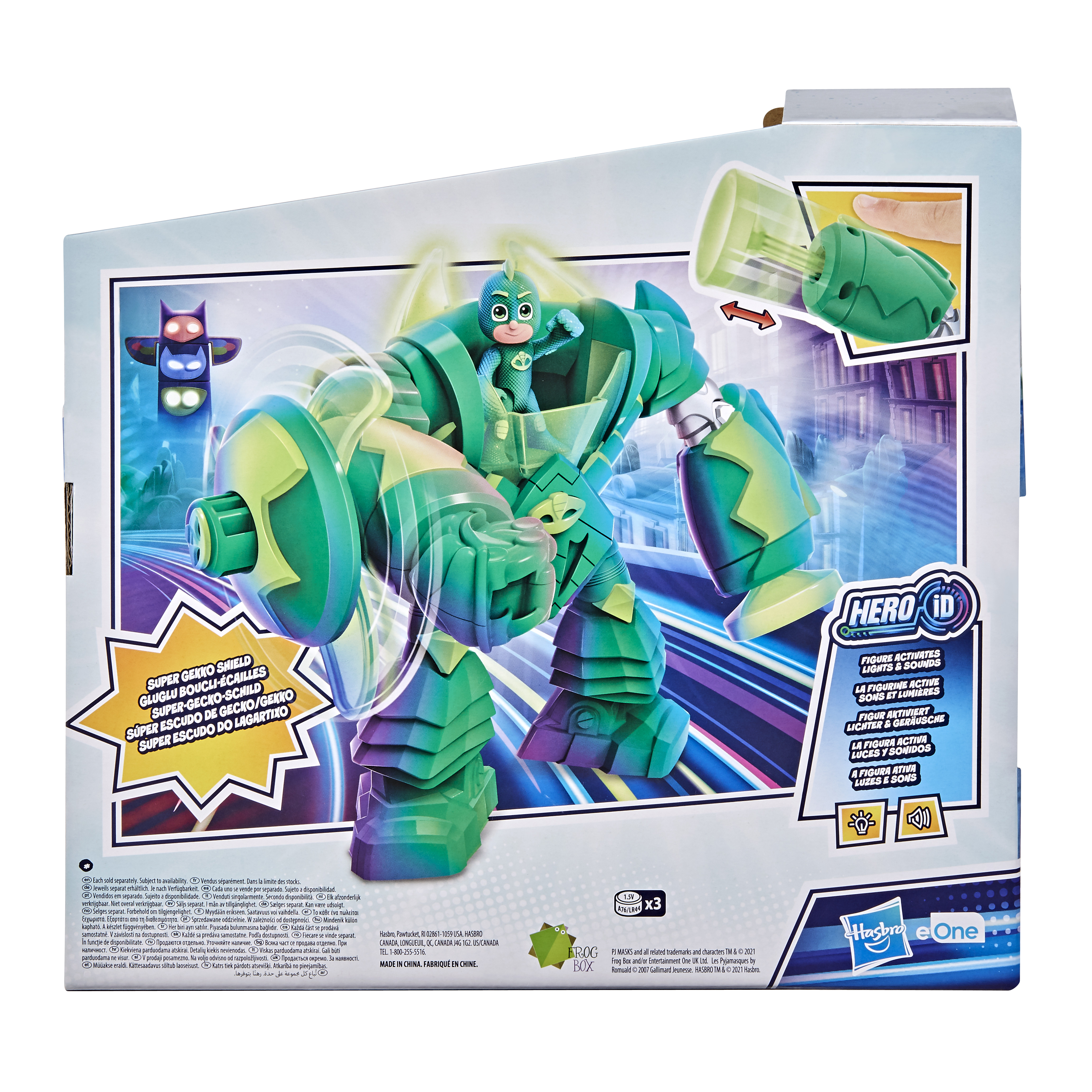 Pyjamasques, à la rescousse ! Avec le Robo-Gluglu, c'est parti pour des moments de jeu encore plus puissants ! La Robo-Combi de Gluglu est prête pour le combat avec la technologie Hero ID de Hasbro, qui reconnaît les figurines Pyjamasques compatibles et y réagit en activant des sons et lumières caractéristiques. Quand on place la figurine Gluglu dans la Robo-Combi, celle-ci émet des bruits de héros et des phrases comme « PJ Masks to the rescue! », mais quand on y place une figurine de méchant (vendue séparément, dans la limite des stocks), la Robo-Combi fait retentir une alarme pour indiquer la présence d'un intrus ! Le Robo-Gluglu a une amulette-bouton à l'avant qui active des sons et lumières. Ses super bras reproduisent les super-pouvoirs de Gluglu, comme le Gluglu Boucli-écailles activé par un bouton et le Gluglu Mains-collantes grâce à une ventouse extensible. La gamme inclut aussi le Robo-Yoyo (vendu séparément, dans la limite des stocks) pour s'amuser encore plus ! Un super cadeau d'anniversaire ou de fête de fin d'année pour les enfants. Dès 3 ans. HASBRO et tous les termes associés sont des marques de commerce de Hasbro.