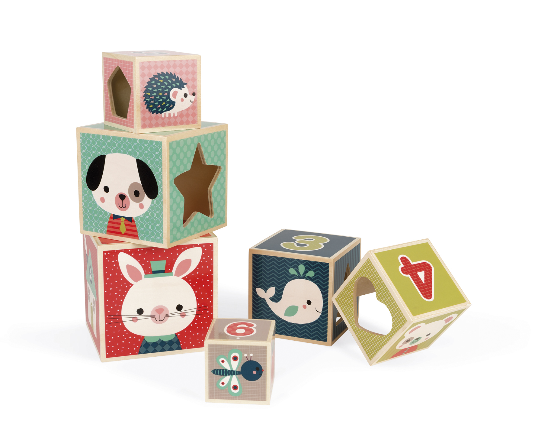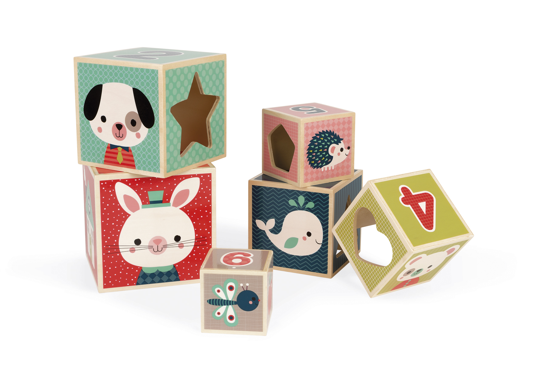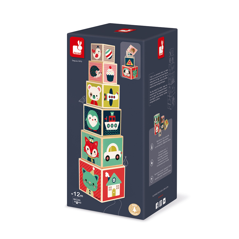Ce jeu de construction, composé de 6 cubes encastrables en bois, va encourager l''enfant à développer sa coordination et son sens de l''observation. Chaque face du cube est illustrée sur un thème différent : animaux, chiffres, formes, objets... Chaque cube possède une face ajourée avec une forme reconnaissable (coeur, étoile, triangle...) qui laissera apparaitre l''animal du cube encastré. Bois : contreplaqué. Impression : transfert à chaud. Boite fermée