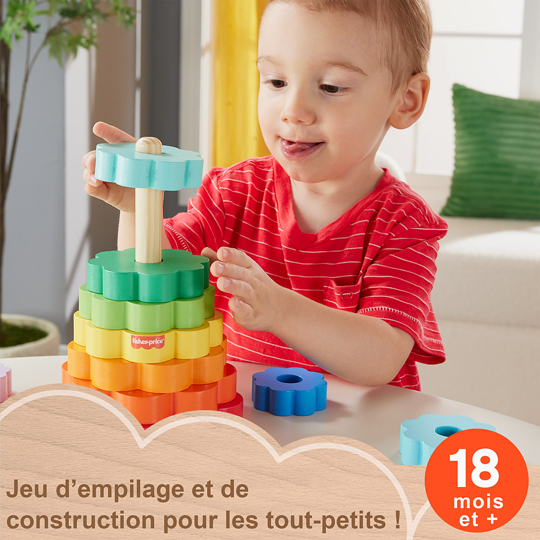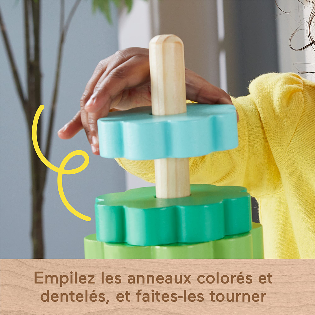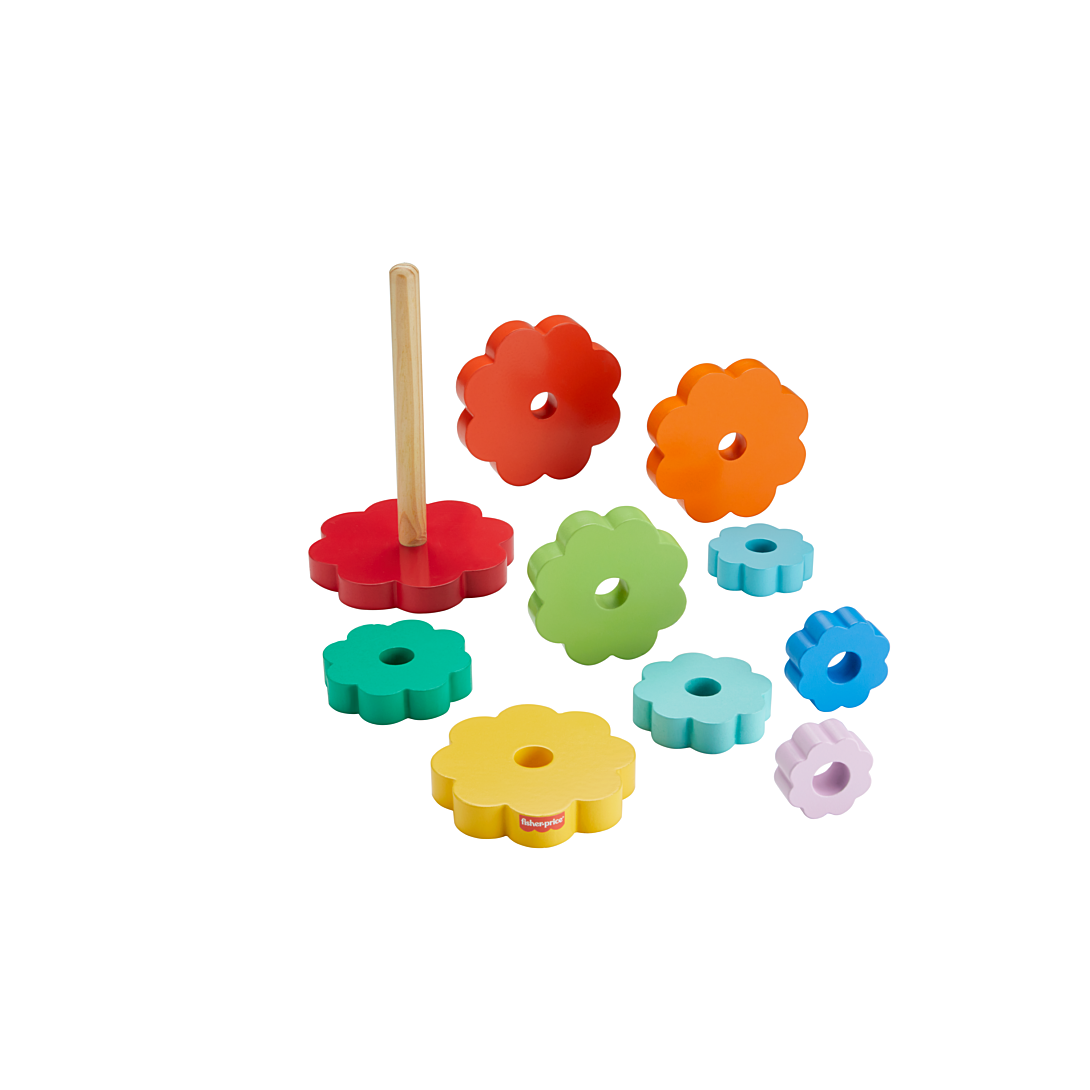 Fleurs en bois et aux couleurs de l’arc en ciel à empiler sur une tige en bois. Parfait pour trier par tailles et couleurs.