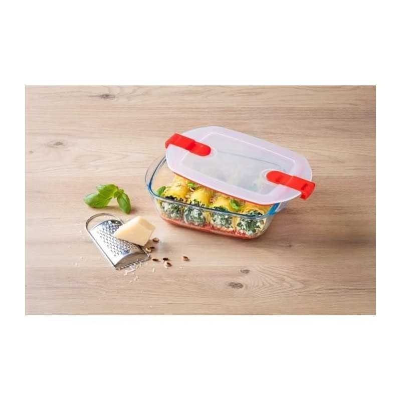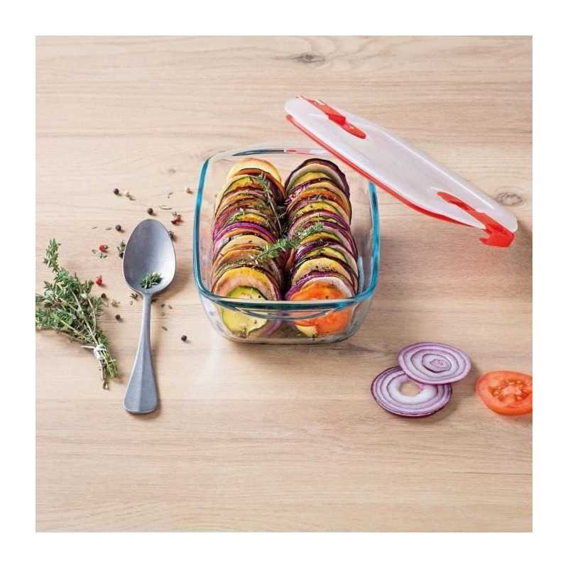 | Plus produit | Couvercle hermétique sans BPA avec 2 valves vapeur et attaches coulissantes; verre borosilicate résistant aux rayures; supporte -40°C à +300°C; résiste aux chocs thermiques; empilable; compatible four, micro-ondes, congélateur et lave-vaisselle; poignées intégrées. |