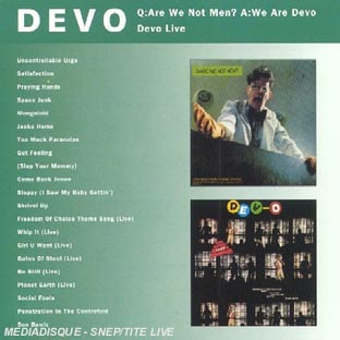 | Liste des pistes | 1.1 . uncontrollable urge - Devo 1.2 . satisfaction - Devo 1.3 . praying hands - Devo 1.4 . space junk - Devo 1.5 . mongoloid - Devo 1.6 . jocko homo - Devo 1.7 . too much paranoias - Devo 1.8 . gut feeling - Devo 1.9 . (slap your mammy) - Devo 1.10 . come back jonee - Devo 1.11 . sloppy (i saw my baby gettin') - Devo 1.12 . shrivel up - Devo 1.13 . freedom of choice theme song (live) - Devo 1.14 . whip it (live) - Devo 1.15 . girl u want (live) - Devo 1.16 . gates of steel (live) - Devo 1.17 . be stiff (live) - Devo 1.18 . planet earth (live) - Devo 1.19 . social fools - Devo 1.20 . penetration in the centrefold - Devo 1.21 . soo bawiz - Devo |