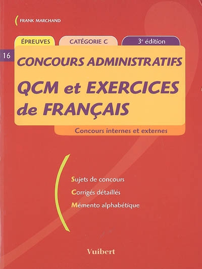 Concours administratifs QCM et Exercices de Français Cet ouvrage, réalisé à partir de récents sujets de concours de la fonction publique, comprend deux parties : . des QCM et courts exercices, répartis en 20 unités de travail, permettent de s'entraîner en grammaire, orthographe, conjugaison, vocabulaire et explication de texte. Ceux-ci sont accompagnés de corrigés détaillés et commentés, qui renvoient systématiquement au mémento de la seconde partie de l'ouvrage ; . un mémento alphabétique résume toutes les connaissances nécessaires. Complet et méthodologique, ce livre favorise la remise à niveau et l'entraînement.