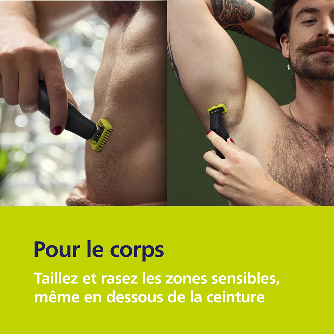 Tailler, styliser, raser facilement n’importe quelle longueur* Le Philips OneBlade Pro Visage + Corps taille, stylise et rase votre corps et votre barbe, même longue. Il comprend une lame pour le visage et une lame avec un système de protection pour zones sensibles. Inutile de multiplier les appareils. Le OneBlade répond à tous vos besoins.