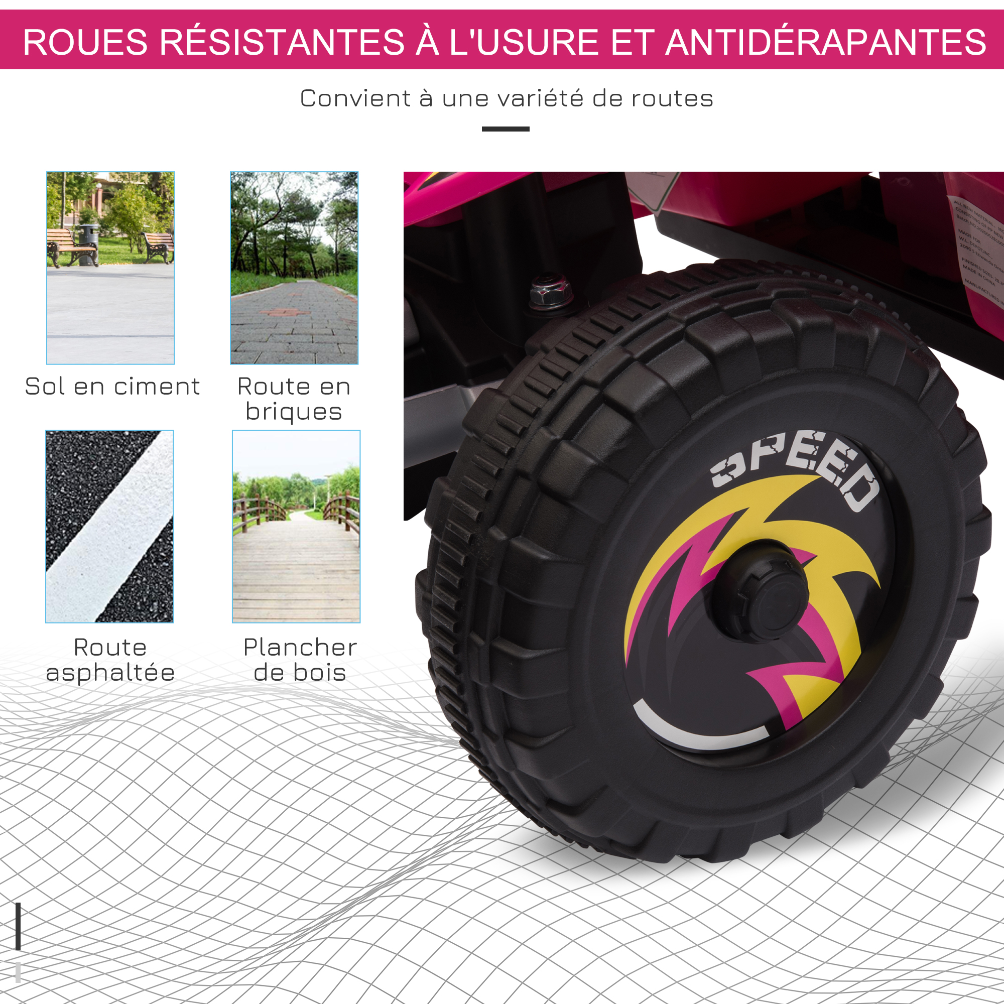 | Libellé | Quad électrique enfant - voiture électrique enfant - marche AV, AR - 6 V, V. max. 4,6 Km/h - rose |