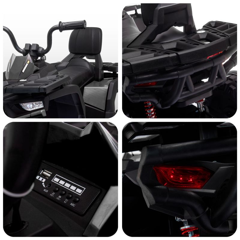 Comme sur les vrais quads, il dispose de phares fonctionnels et d'un jeu de clefs pour le démarrer. Et petit plus, il possède un système audio MP3 intégré (port USB) avec contrôle du volume.