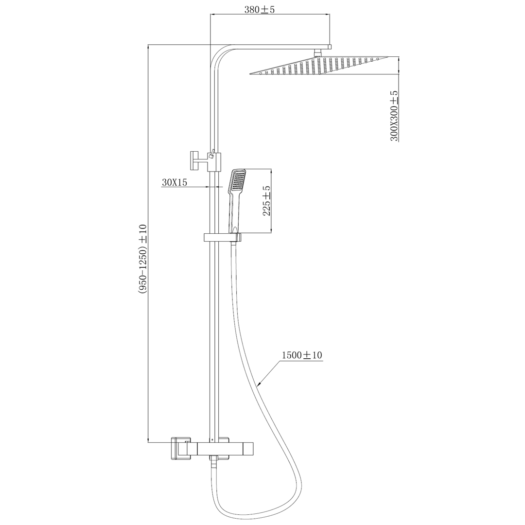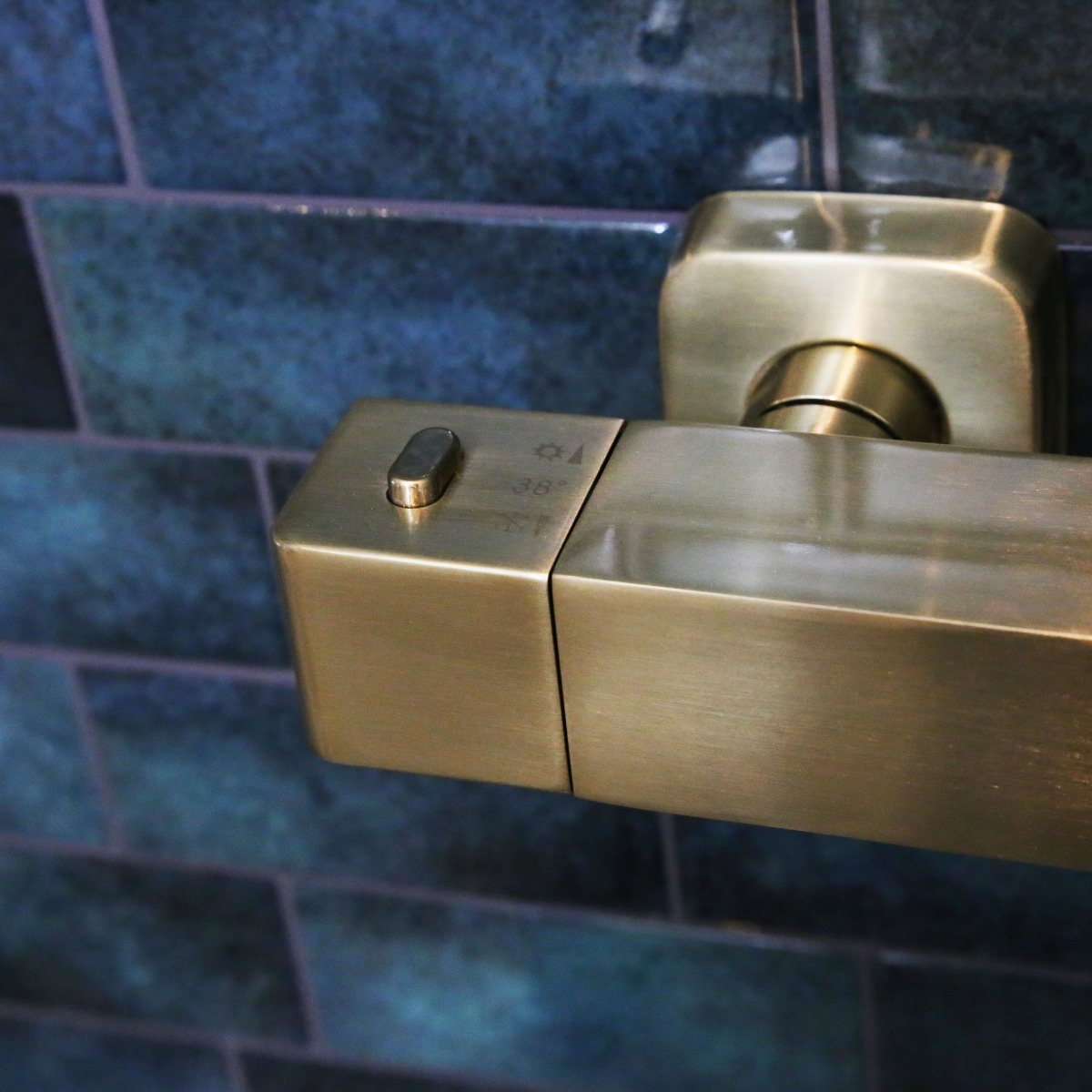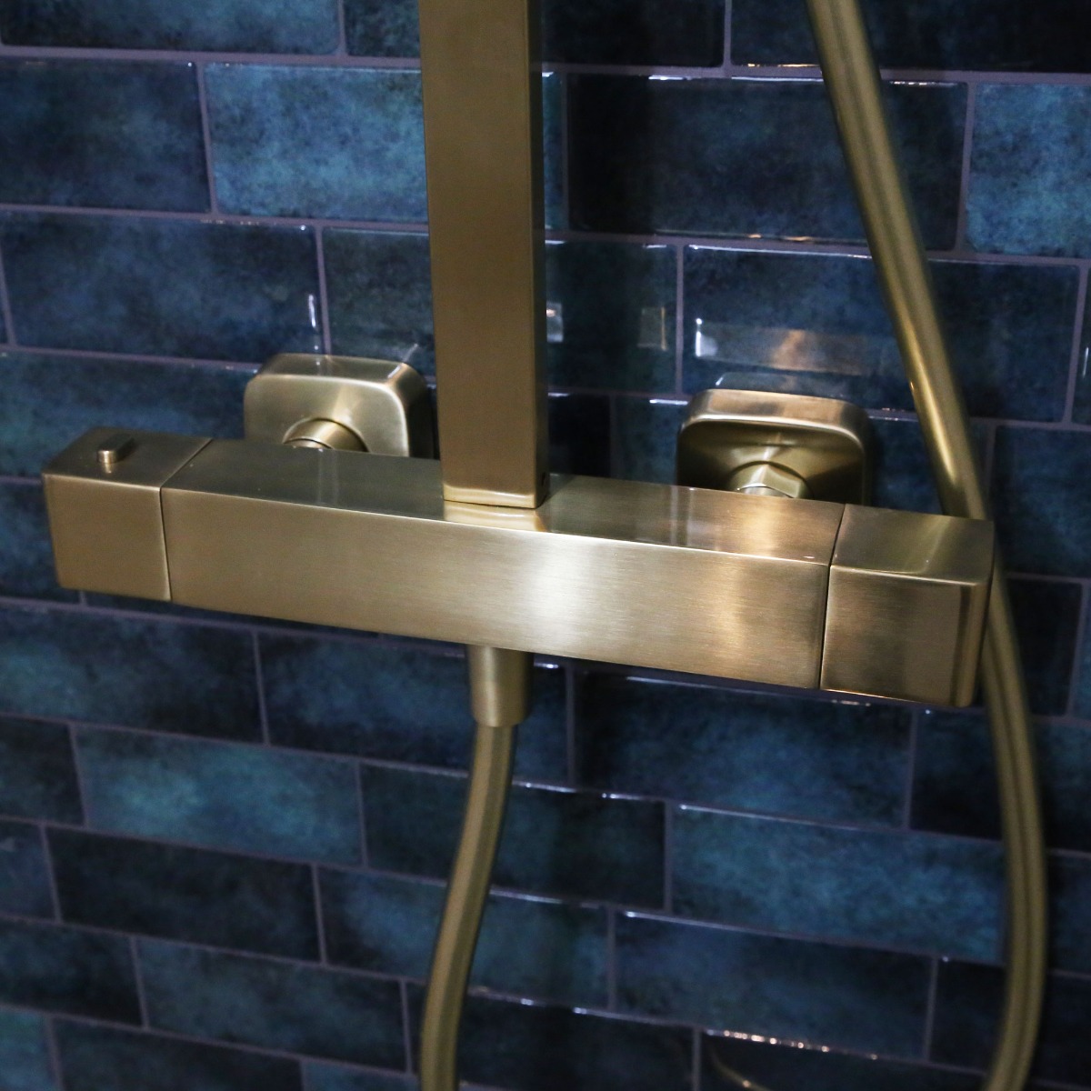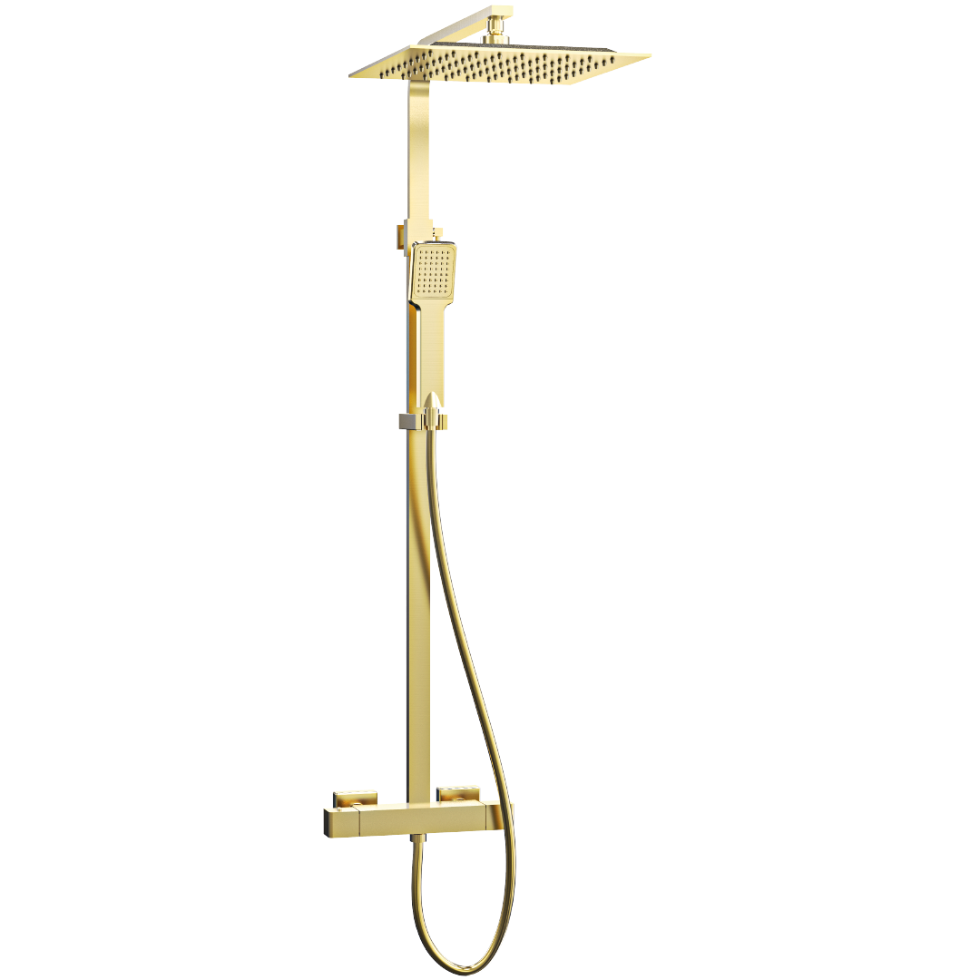 Découvrez ""Quartos"", la magnifique colonne de douche or brossé, équipée d'un thermostatique et d'une pomme de tête de 300 mm. Un design ultra moderne avec son corps et pomme de tête carré.