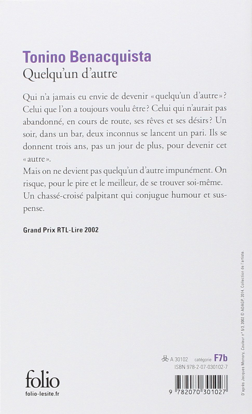 Qui n'a jamais eu envie de devenir "quelqu'un d'autre" ? Celui que l'on a toujours voulu être ? Celui qui n'aurait pas abandonné, en cours de route, ses rêves et ses désirs ? Un soir, dans un bar, deux inconnus se lancent un pari. Ils se donnent trois ans, pas un jour de plus, pour devenir cet "autre". Mais on ne devient pas quelqu'un d'autre impunément. On risque, pour le pire et le meilleur, de se trouver soi-même. Un chassé-croisé palpitant qui conjugue humour et suspense.