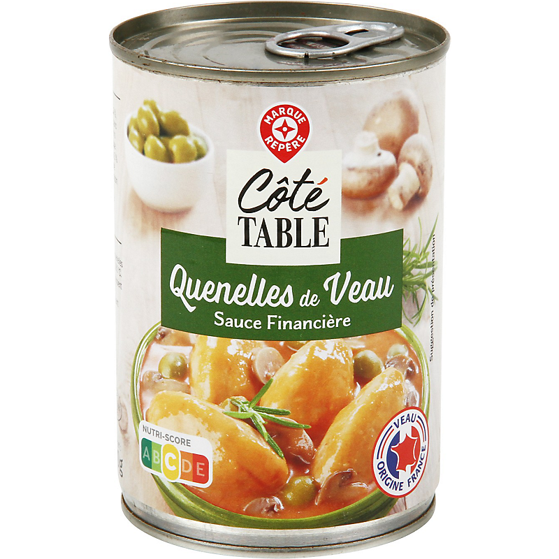 Eau, quenelles de veau 36 % [ farine de blé 11,3 %, graisse de boeuf, eau, viande de veau (origine : France) 4,8 %, blanc d'oeuf, sel, gluten de blé, protéines de lait], champignons de Paris saumurés (champignons de Paris 3 %; eau; sel; acidifiant : acide citrique; antioxydant : acide ascorbique), olives vertes dénoyautées 3 % (olives ; sel ; acidifiants : acide citrique, acide lactique), concentré de tomates, farine de blé 2 %, crème fraîche, arôme naturel, amidon modifié de maïs, amidon de riz, vin blanc, oignon en poudre, ail en poudre, romarin en poudre.