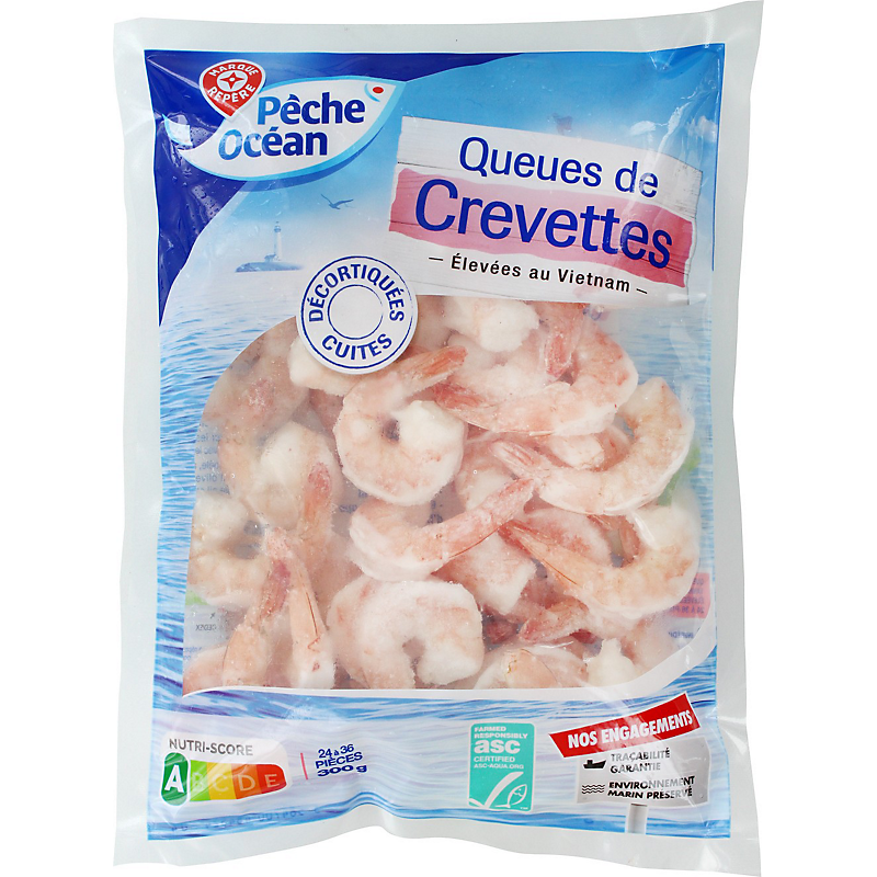 Queues de crevettes (Penaeus vannamei) décortiquées, cuites, élevées au Vietnam, surgelées. 24 à 36 pièces par sachet. PECHE OCEAN