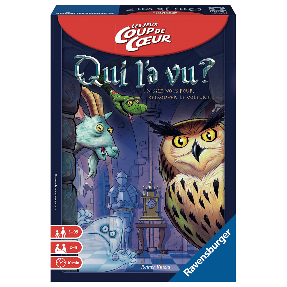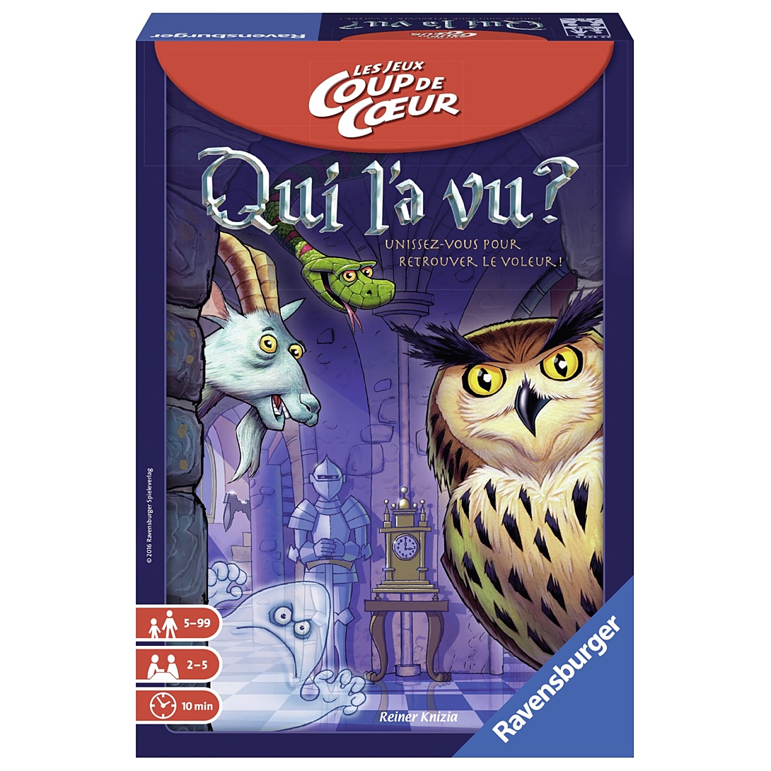 Plus produit UNE EXPÉRIENCE IMMERSIVE : Dans un royaume où tout le monde vit paisiblement grâce au roi qui possède un anneau magique ! Malheureusement la bague magique a été volée ! C\'est à vous de jouer ! Unissez-vous et avancez ensemble, car c\'est le seul moyen de retrouver le voleur ! Retrouvez qui a volé l\'anneau avant le temps imparti ! VERSION COUP DE CUR : Vous adorez Qui l\'a vu ? Vous en voulez toujours plus et où que vous alliez ? Grâce à son petit format, Qui l\'a vu vous suivra partout. Glissez-le dans votre sac et jouez où que vous soyez ! Vous cherchez une idée de cadeau pour un anniversaire ? Avec son prix malin, ce jeu est un sans faute assuré ! DES RÈGLES SIMPLES pour toute la famille. Le joueur dont c\'est le tour lance le dé et fait ce qui est demandé en fonction de la face du dé (Horloge, Fantôme, Dé ou 1,2,3 points). Une fois sur une case, effectuez une des 5 actions proposés : Animal avec un jeton Nourriture, Animal sans jeton Nourriture, Fée, Etoile magique ou Case Horloge. PARTIES RAPIDES : Le jeu idéal pour un après-midi amusant pour 2 à 5 joueurs : grâce au suspense permanent, aux règles de jeu simples et aux tours de jeu courts, même les plus petits sont directement enthousiasmés. Un jeu aussi facile à ranger qu\'à jouer ! CONTENU : 11 cases Animal, 3 cases Action, 12 cartes Suspect, 12 cartes Innocent, 12 jetons Nourriture, 1 horloge Fantôme, 1 pion, 1 dé Symboles, 1 règle du jeu. De 2 à 5 joueurs. Vous en voulez plus ? Retrouver les autres jeux classiques en version petit prix : Labyrinthe, Croque-Carotte, Qui l\'a vu ?, Ramsès et Rush Hour.