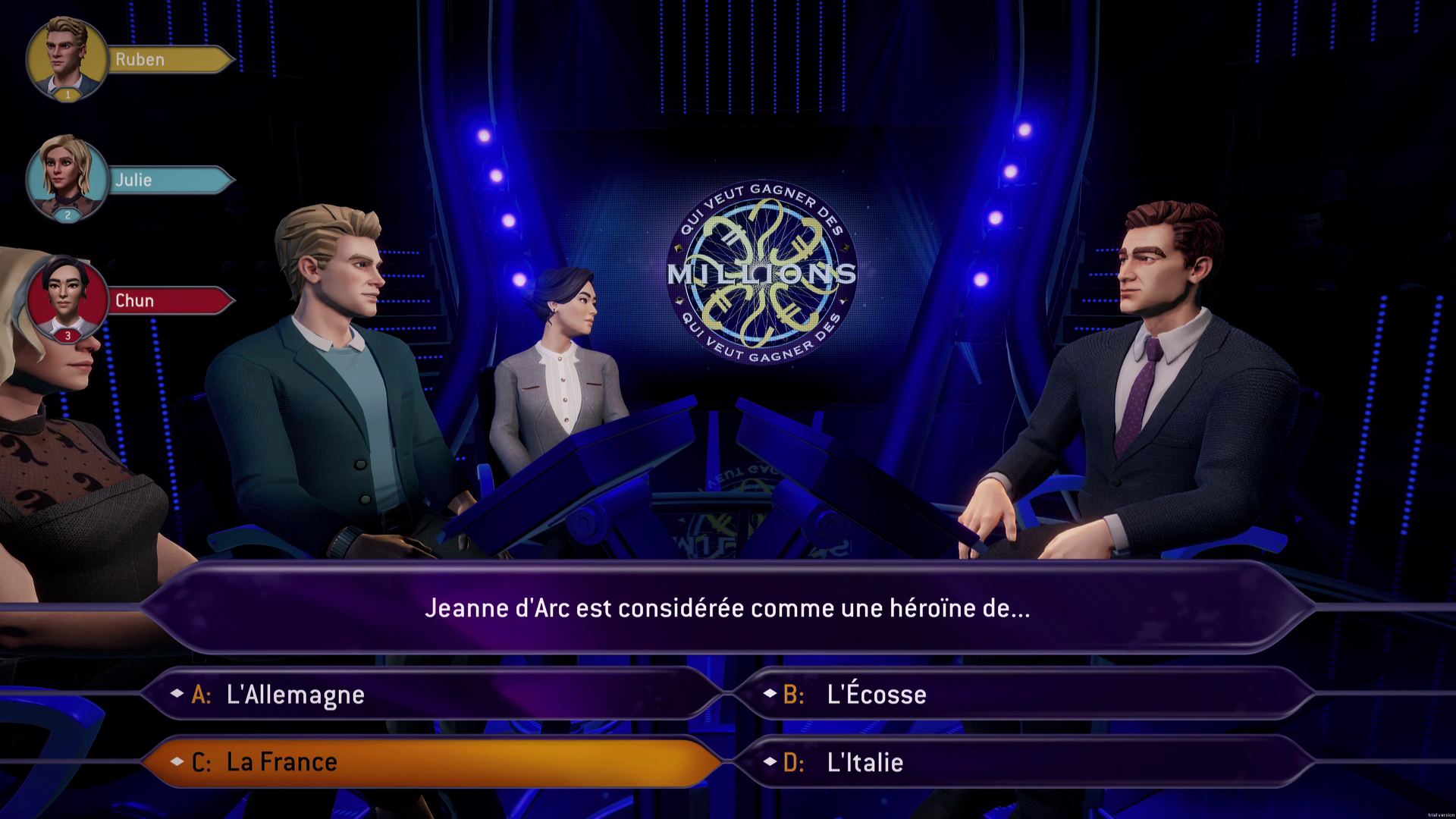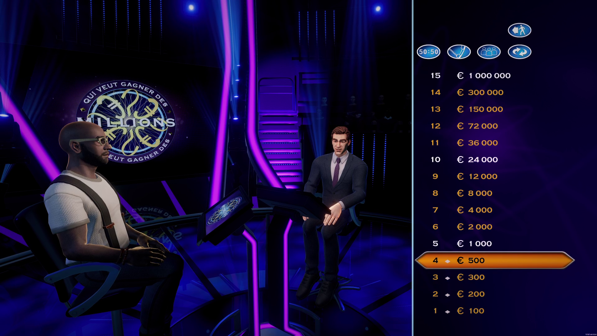 Mobilisez toutes vos connaissances et décrochez le jackpot en évitant les questions pièges : retrouvez l'ambiance pleine de suspense de l'émission « Qui veut gagner des millions ? » sur le plateau de votre choix ! En 15 questions, le candidat aura fort à faire pour escalader la pyramide des gains et l'emporter : plus de 8.000 questions thématiques variées (géographie, sciences, histoire, mais aussi divertissement ou arts), une difficulté croissante au fil des paliers franchis, une pression qui augmente avec le public et l'animateur... Musique, plateau, comportement de l'animateur... toutes les conditions sont réunies pour revivre l'expérience authentique de l'émission ! Royaume-Uni, Etats-Unis, Espagne, Italie, Allemagne et France... chacun de ces 6 pays bénéficie chacun de 2000 questions exclusives, disponible dans la langue maternelle des joueurs.