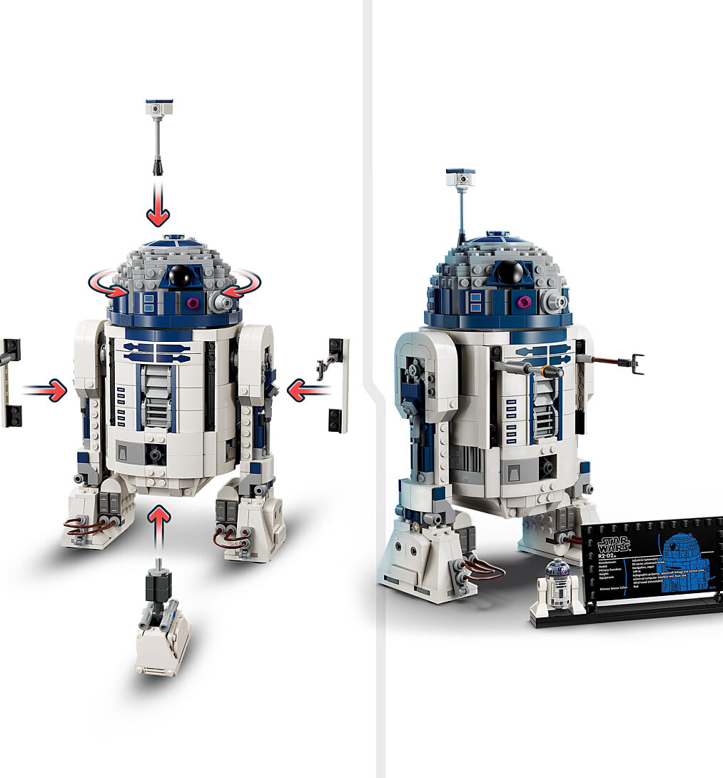 Invitez les enfants à construire le droïde le plus adorable de la galaxie Star Wars™ avec un modèle de R2-D2 en briques LEGO® (75379). Ce personnage à construire et exposer conçu pour les garçons et les filles dès 10 ans regorge de fonctionnalités réalistes qui leur permet de rejouer des scènes culte ou d’inventer leurs propres scénarios. Le modèle inclut une tête qui pivote à 360° ainsi qu’une troisième jambe, un périscope et des outils amovibles. Pour créer une pièce fascinante, ce set de construction collector inclut également une figurine LEGO du droïde R2-D2, une minifigurine LEGO Star Wars spéciale 25e anniversaire de Dark Malak avec un sabre laser et un support, ainsi qu’une plaque descriptive de R2-D2. Formidable idée de cadeau pour les fans de Star Wars et les collectionneurs d’objets Star Wars, ce set inclut des instructions étape par étape. L’application LEGO Builder propose également des outils de zoom et de rotation, qui enrichissent l’expérience créative des enfants.
