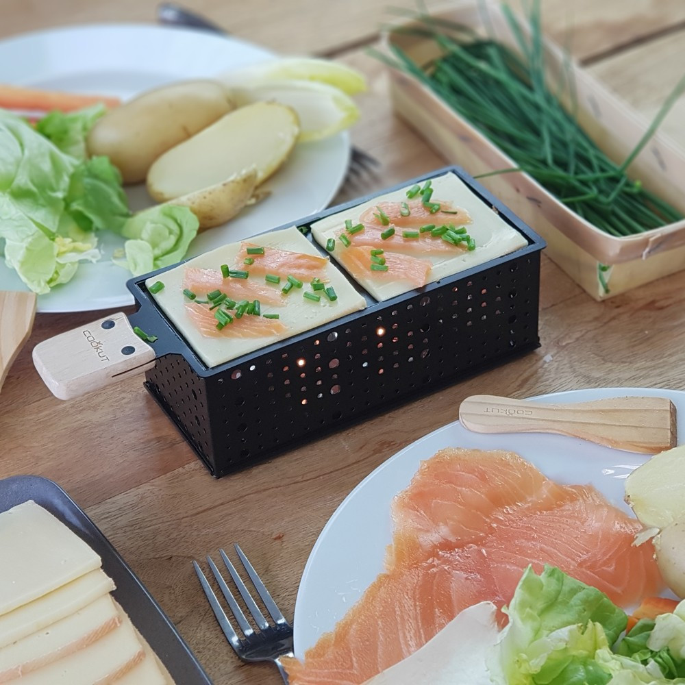 Appareil à raclette à la bougie pour 1 à 2 personnes. Avec Lumi, tu peux cuire ta raclette simplement à la bougie chauffe-plats. C'est simple et ça te permet de pouvoir emporter ou utiliser ton Lumi partout, pas besoin d'électricité. En plus son look de raclette moderne te permettra de recevoir tes convives avec élégance. En duo cet appareil à raclette est idéal pour une soirée en amoureux. Avec sa grande taille, tu peux faire fondre 2 tranches de fromages en même temps, pour les grands gourmands impatients ! Dimension : 23 x 8 x 6,5cm Matière : acier revêtu anti-adhérent sans PFOA/BPA, bois, sangle en coton Fonctionne avec 6 bougies chauffe-plat standards non fournies Ne passe pas au lave vaisselle