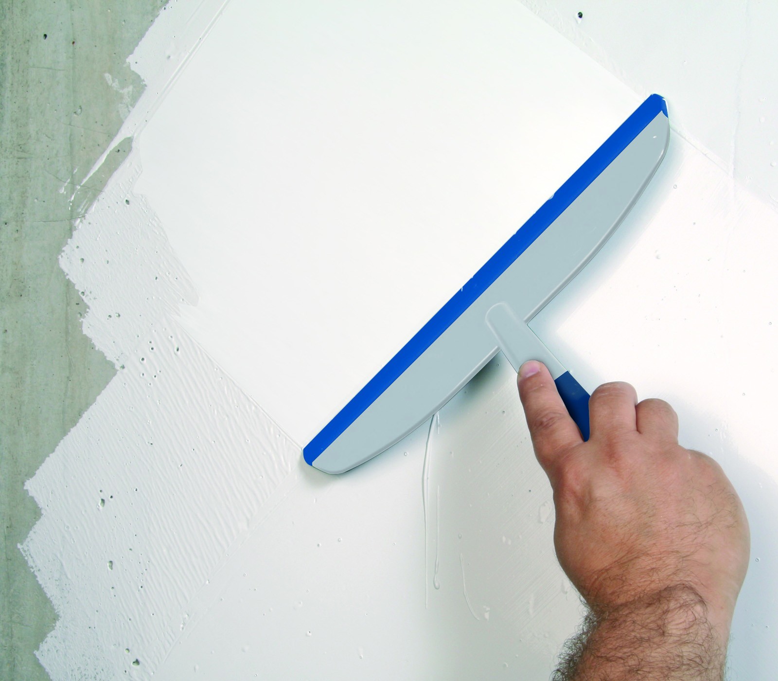 2 - Procéder ensuite au lissage de votre support avec la raclette. Commencer par lisser les zones de 1m² en commençant en bas à droite. Croiser les passages perpendiculairement.